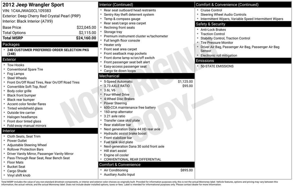 Deep Cherry Red Crystal Pearlcoat 2012 Jeep Wrangler Sport 4WD 5-Speed Automatic 3.6L V6 24V VVTRecent Arrival!Awards: * 2012 KBB.com Best Resale Value Awards * 2012 KBB.com Total Cost of Ownership Awards