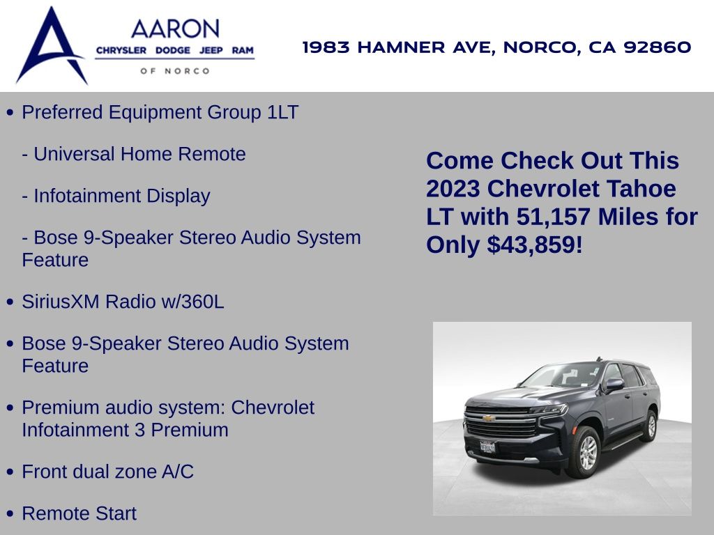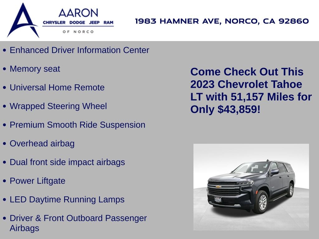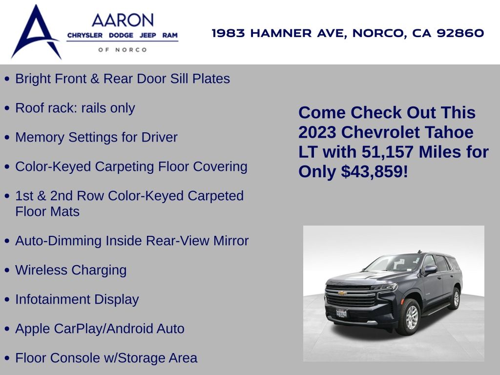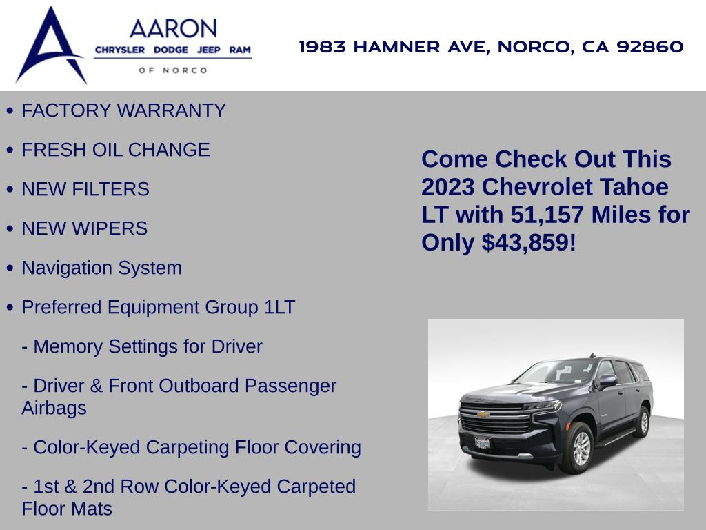 Priced below KBB Fair Purchase Price!FACTORY WARRANTY, FRESH OIL CHANGE, NEW FILTERS, NEW WIPERS, Tahoe LT, 4D Sport Utility, EcoTec3 5.3L V8, 10-Speed Automatic with Overdrive, RWD, Jet Black Leather, 1st & 2nd Row Color-Keyed Carpeted Floor Mats, 3rd row seats: split-bench, Alloy wheels, Apple CarPlay/Android Auto, Auto-Dimming Inside Rear-View Mirror, Bose 9-Speaker Stereo Audio System Feature, Bright Front & Rear Door Sill Plates, Color-Keyed Carpeting Floor Covering, Driver & Front Outboard Passenger Airbags, Dual front side impact airbags, Enhanced Driver Information Center, Floor Console w/Storage Area, Front dual zone A/C, Hands-Free Rear Power Programmable Liftgate, Heated front seats, Infotainment Display, Leather-Appointed Seat Trim, LED Daytime Running Lamps, Memory seat, Memory Settings for Driver, Navigation System, Overhead airbag, Power Liftgate, Preferred Equipment Group 1LT, Premium audio system: Chevrolet Infotainment 3 Premium, Premium Smooth Ride Suspension, Remote Start, Roof rack: rails only, SiriusXM Radio w/360L, Universal Home Remote, Wireless Charging, Wrapped Steering Wheel.Clean CARFAX.CARFAX One-Owner.