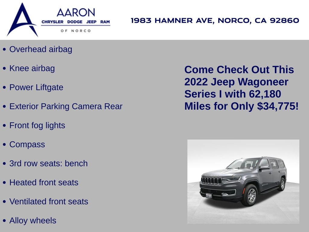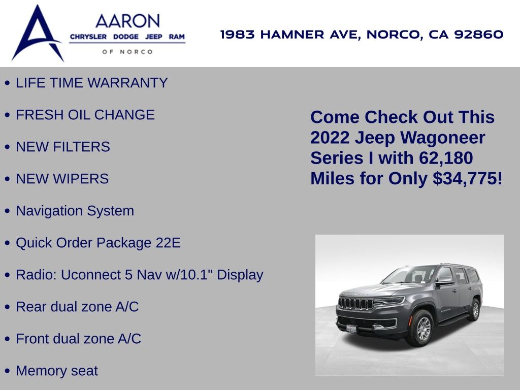 Priced below KBB Fair Purchase Price!LIFE TIME WARRANTY, FRESH OIL CHANGE, NEW FILTERS, NEW WIPERS, Wagoneer Series I, 4D Sport Utility, 5.7L V8, 8-Speed Automatic, 4WD, 3rd row seats: bench, Alloy wheels, Compass, Exterior Parking Camera Rear, Front dual zone A/C, Front fog lights, Heated front seats, Knee airbag, Memory seat, Navigation System, Overhead airbag, Power Liftgate, Quick Order Package 22E, Radio: Uconnect 5 Nav w/10.1" Display, Rear dual zone A/C, Ventilated front seats.Clean CARFAX.CARFAX One-Owner.