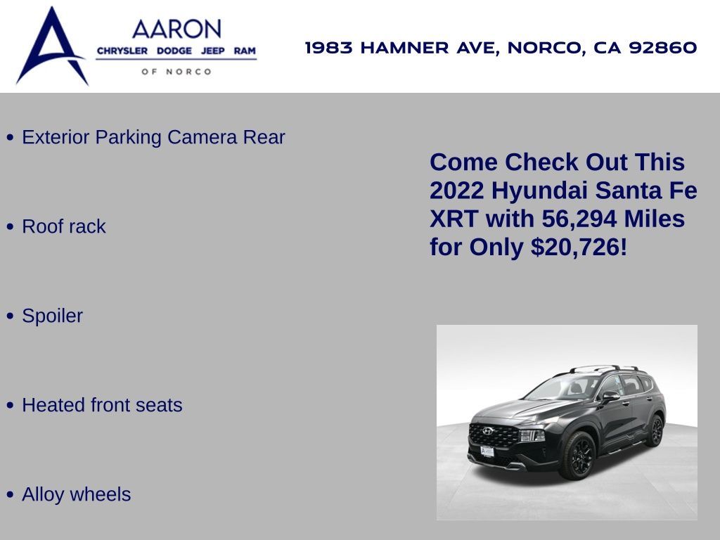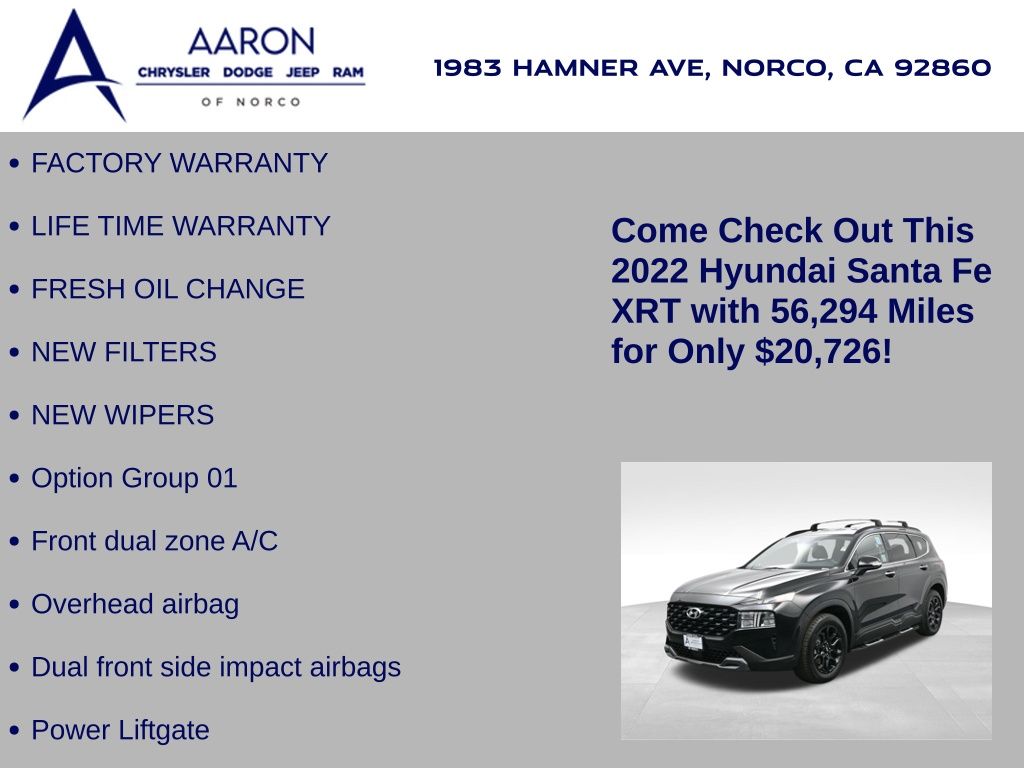 Priced below KBB Fair Purchase Price!FACTORY WARRANTY, FRESH OIL CHANGE, NEW FILTERS, NEW WIPERS, LIFE TIME WARRANTY, Santa Fe XRT, 4D Sport Utility, 2.5L I4, FWD, Black Cloth, Alloy wheels, Dual front side impact airbags, Exterior Parking Camera Rear, Front dual zone A/C, Heated front seats, Option Group 01, Overhead airbag, Power Liftgate, Roof rack, Spoiler.Clean CARFAX.