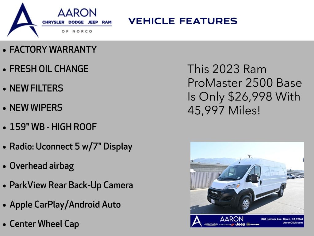 Priced below KBB Fair Purchase Price!FACTORY WARRANTY, FRESH OIL CHANGE, NEW FILTERS, NEW WIPERS, 159" WB - HIGH ROOF, ProMaster 2500 High Roof 159 WB, 3D Cargo Van, 3.6L V6 24V VVT, 9-Speed 948TE Automatic, FWD, Apple CarPlay/Android Auto, Center Wheel Cap, Overhead airbag, ParkView Rear Back-Up Camera, Radio: Uconnect 5 w/7" Display.Clean CARFAX.CARFAX One-Owner.