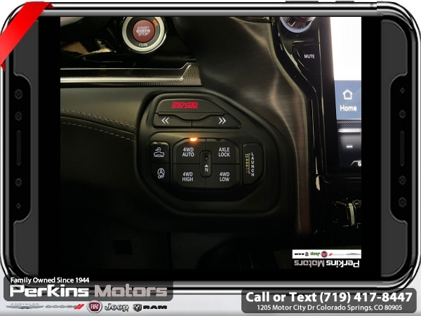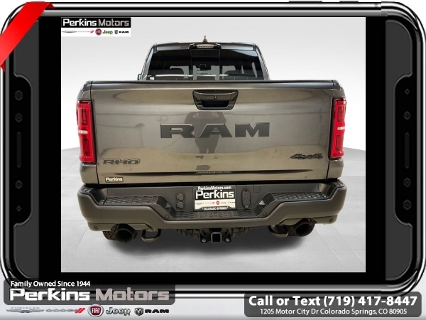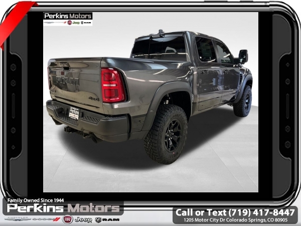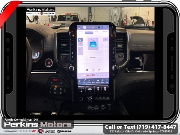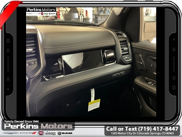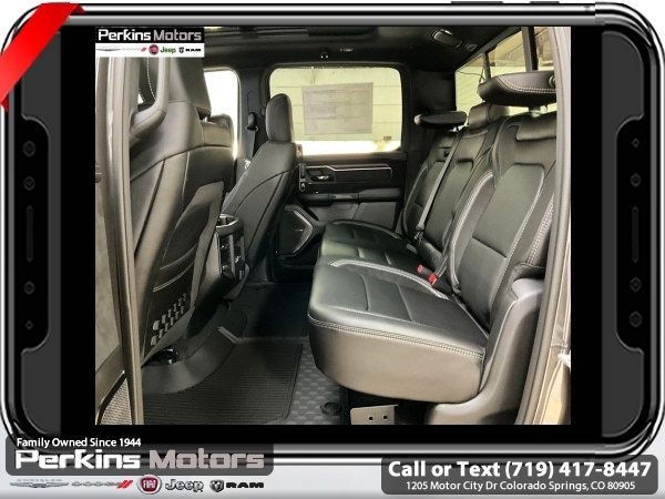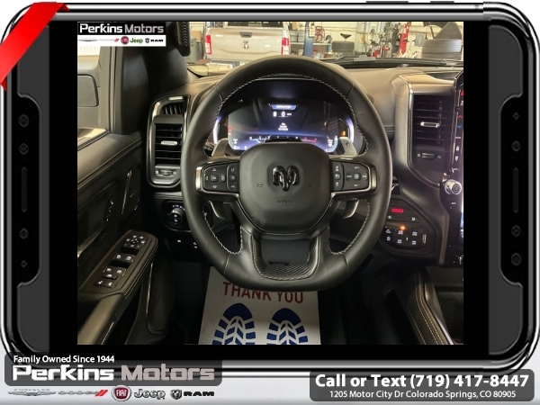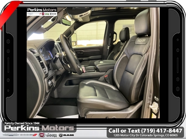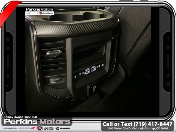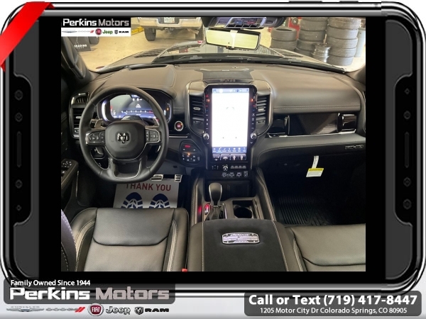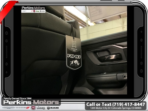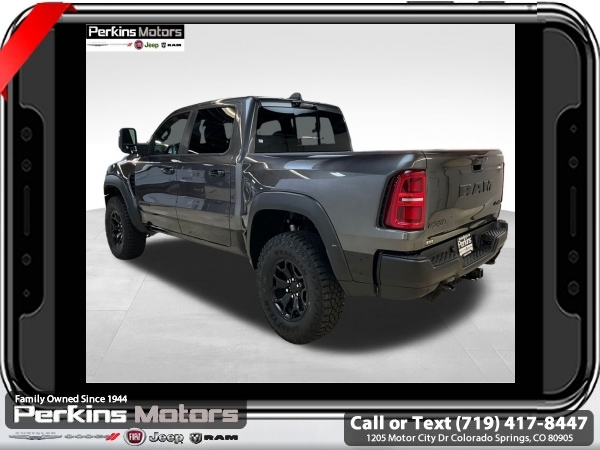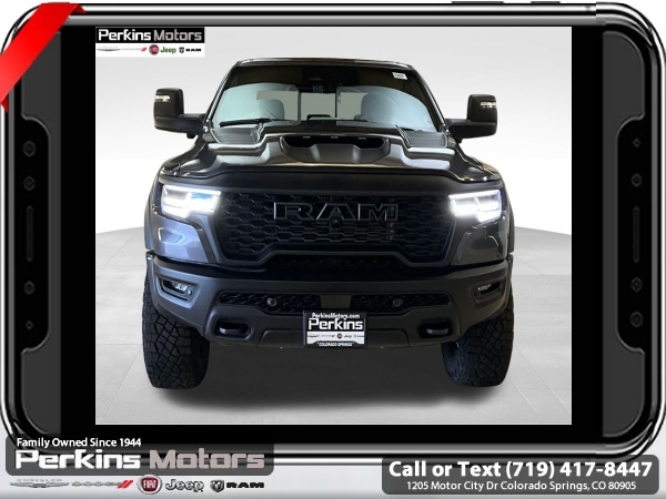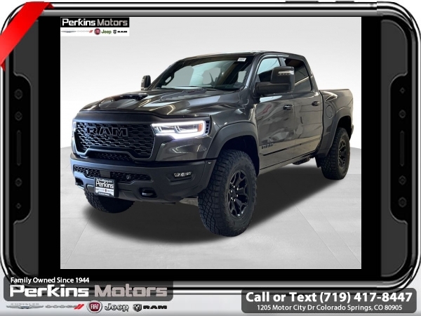 Factory MSRP: $86,010 $1,000 off MSRP! Granite Crystal Metallic Clearcoat 2025 Ram 1500 RHO 4WD 8-Speed Automatic 3.0L I6<br><br>Check us out at www.perkinsmotors.com to see our specials! Since opening our doors in 1944, we’ve been proud to serve Colorado Springs, CO, and the surrounding areas of Pueblo, Castle Rock and Denver, CO. Throughout this time of being family owned for 80 years, we’ve maintained a firm commitment to our customers: to offer a wide selection of New Chrysler, Dodge, Fiat, Jeep, and Ram vehicles and quality pre-owned vehicles, and provide a quick, no-hassle car-buying process that ensures everyone drives off the lot satisfied with their purchase.<br><br>Quick Order Package 22Y RHO, RHO Level 1 Equipment Group (12-Way/1-Way Trailer Connector, 14.4 Touchscreen Display, 240 Amp Alternator, 4G LTE Wi-Fi Hot Spot, Apple CarPlay, Connected Travel & Traffic Services, Connectivity - US/Canada, Driver Power Seat Back Massage, Driver Seat Memory, Driver/Passenger Wrapped Assist Handles, Drowsy Driver Detection, Dual Wireless Charging Pad, Evasive Steer Assist, Exterior Mirrors w/Memory, Front Passenger Interactive Display, Front Passenger Power Seat Back Massage, Full Length Premium Upgraded Floor Console, Google Android Auto, GPS Navigation, Hands-Free Active Driving Assist System, harman/kardon 19 Speaker Premium Sound, HD Radio, Heads-Up Display, Heated Second Row Seats, Integrated Voice Command w/Bluetooth, Intersection Collision Assist System, Leather/Carbon Flat-Bottom Steering Wheel, LED CHMSL Lamp, Luxury Front Door Trim Panel, Power Adjustable Pedals w/Memory, Power Tailgate, Premium Wrapped I/P Bezel, Radio: Uconnect 5 Nav w/14.4 Display, Radio/Driver Seat/Mirrors/Pedals Memory, Rain Sensitive Windshield Wipers, Real Carbon Fiber Interior Accents, Rear 60/40 Folding Split Recline Seat, Smartphone As A Key Capable, Surround View Camera System, Traffic Sign Recognition, USB Host Flip, Ventilated Front Seats, and Ventilated Rear Seats), Towing Technology Group (Trailer Hitch Line-Up Assist and Trailer Reverse Guidance), Trailer Tow Group (Trailer Reverse Steering Control and Trailer Tire Pressure Monitoring System), 10 Speakers, 3.92 Rear Axle Ratio, 4-Wheel Disc Brakes, ABS brakes, Adaptive suspension, Adjustable pedals, Air Conditioning, Alloy wheels, AM/FM radio: SiriusXM with 360L, Apple CarPlay/Android Auto, Auto High-beam Headlights, Auto Power-Folding Mirrors, Auto-dimming door mirrors, Auto-Dimming Exterior Driver Mirror, Auto-Dimming Exterior Passenger Mirror, Auto-dimming Rear-View mirror, Automatic temperature control, Black Exterior Mirrors, Black Power-Fold Trailer Tow Mirrors, Brake assist, Compass, Cruise Control, Delay-off headlights, Dome Dual LED Reading Lamp, Driver door bin, Driver vanity mirror, Dual front impact airbags, Dual front side impact airbags, Dual-Pane Panoramic Sunroof, Electronic Stability Control, Exterior Mirrors Courtesy Lamps, Exterior Mirrors w/Heating Element, Exterior Mirrors w/Supplemental Signals, Flareside Box, Forward & Reverse Utility Lights, Front anti-roll bar, Front Bucket Seats, Front Center Armrest w/Storage, Front dual zone A/C, Front fog lights, Front License Plate Bracket, Front reading lights, Front wheel independent suspension, Fully automatic headlights, Garage door transmitter, Heated door mirrors, Heated front seats, Heated steering wheel, Illuminated entry, Leather Shift Knob, Leather steering wheel, Leather Trimmed Bucket Seats, Low tire pressure warning, Manufacturer's Statement of Origin, Mirror Clearance/Running Lights, Navigation System, Occupant sensing airbag, Outside temperature display, Overhead airbag, Overhead console, Panic alarm, ParkView Rear Back-Up Camera, Passenger door bin, Passenger vanity mirror, Power door mirrors, Power driver seat, Power pas Sale price includes all manufacture's incentives and dealer discounts. Sale price not available on lease or compatible with special APR. $1000 - 2025 National Bonus Cash . Exp. 0