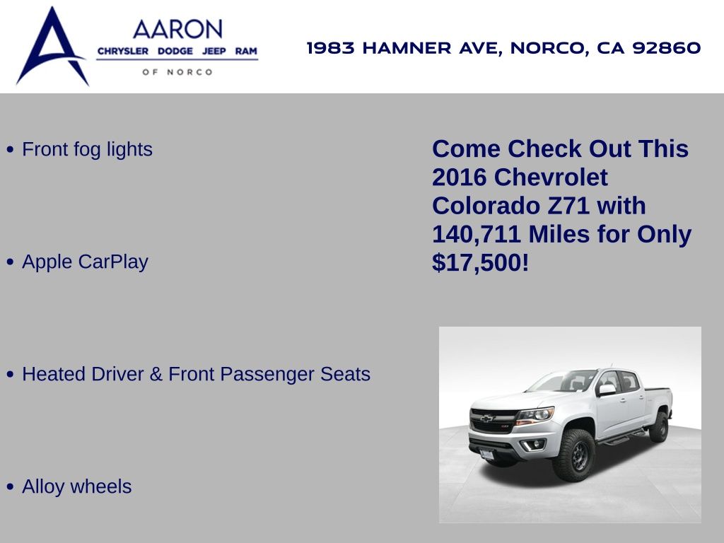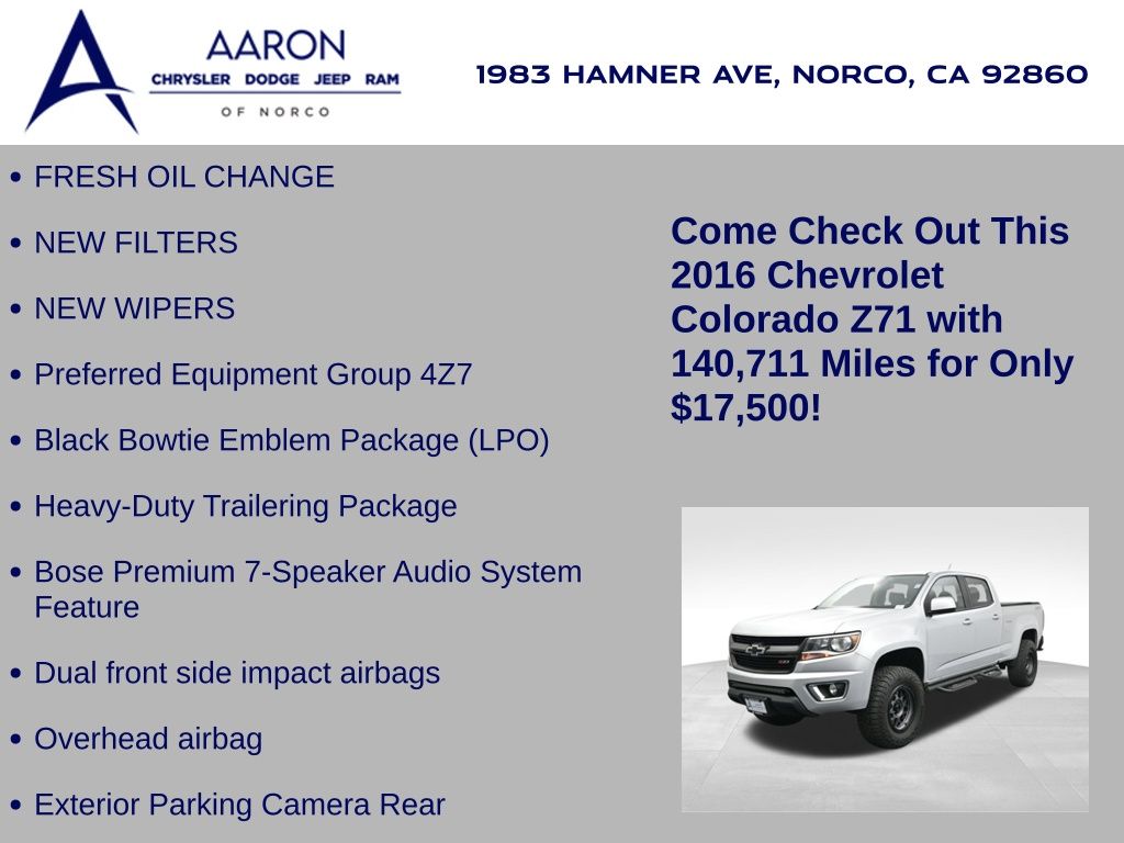 FRESH OIL CHANGE, NEW FILTERS, NEW WIPERS, Colorado Z71, 4D Crew Cab, 3.6L 6-Cylinder DGI DOHC, 6-Speed Automatic, 4WD, Alloy wheels, Apple CarPlay, Black Bowtie Emblem Package (LPO), Bose Premium 7-Speaker Audio System Feature, Dual front side impact airbags, Exterior Parking Camera Rear, Front fog lights, Heated Driver & Front Passenger Seats, Heavy-Duty Trailering Package, Overhead airbag, Preferred Equipment Group 4Z7.Clean CARFAX.CARFAX One-Owner.Awards: * 2016 KBB.com Best Resale Value Awards * 2016 KBB.com Best Buy Awards Finalist