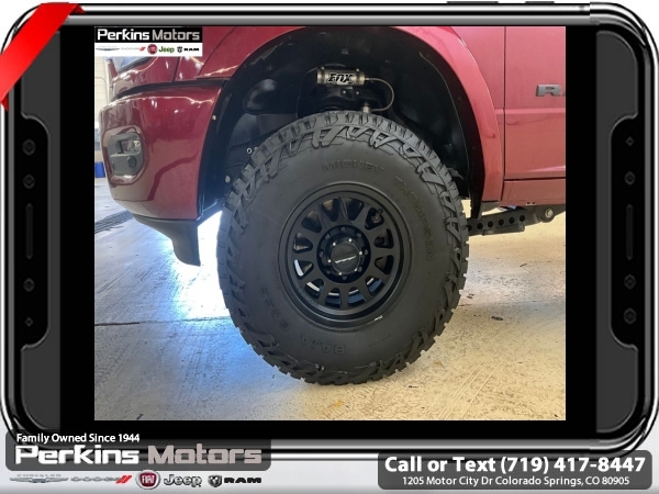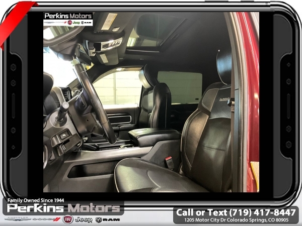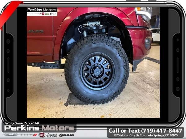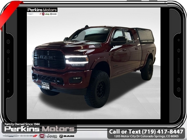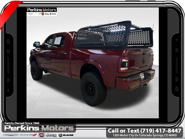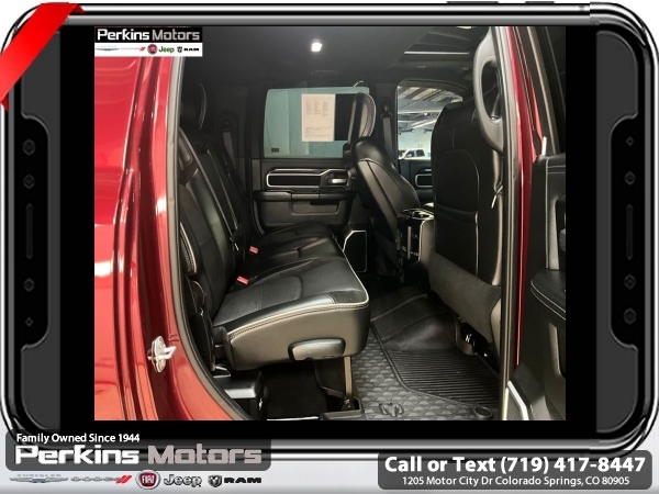 Delmonico Red Pearlcoat 4WD Cummins 6.7L I6 Turbodiesel 6-Speed Automatic<br><br><br>Check us out at www.perkinsmotors.com to see our specials! Since opening our doors in 1944, we’ve been proud to serve Colorado Springs, CO, and the surrounding areas of Pueblo, Castle Rock and Denver, CO. Throughout this time of being family owned for 80 years, we’ve maintained a firm commitment to our customers: to offer a wide selection of New Chrysler, Dodge, Fiat, Jeep, and Ram vehicles and quality pre-owned vehicles, and provide a quick, no-hassle car-buying process that ensures everyone drives off the lot satisfied with their purchase.<br><br><br>Awards:<br> * JD Power Initial Quality Study (IQS)<br><br>DOT Certified Roadside Safety Kit (2 Red Vinyl Flags, 3 Reflecting Triangles, DOT Fire Extinguisher, and Spare Fuses), Laramie Level 2 Equipment Group (DISC) (1-Year SiriusXM Guardian Trial, 17 Speaker harman kardon Premium Sound, 4G LTE Wi-Fi Hot Spot, 5-Year SiriusXM Traffic Service, 5-Year SiriusXM Travel Link Service, 8.4 Touchscreen Display, Apple CarPlay, Auto High Beam Headlamp Control, Blind Spot & Cross Path Detection (DISC), Disassociated Touchscreen Display, Exterior Mirrors w/Memory, Foam Bottle Insert (Door Trim Panel), For Details Visit DriveUconnect.com, Google Android Auto, GPS Antenna Input, GPS Navigation, HD Radio, Heated Second Row Seats, Integrated Center Stack Radio, Integrated Voice Command w/Bluetooth, Mirror-Mounted Aux Reverse Lamps, Off-Road Information Pages, Power Adjustable Convex Aux Mirrors, Power Adjustable Pedals w/Memory, Pwr Convenience Chrome Tow Mirrors w/Spotter & Memory, Radio: Uconnect 4C Nav w/8.4 Display, Radio/Driver Seat/Mirrors/Pedals Memory, Rain Sensitive Windshield Wipers, Remote Tailgate Release, Selectable Tire Fill Alert, SiriusXM Satellite Radio, SiriusXM Traffic Plus, SiriusXM Travel Link, and Ventilated Front Seats), Night Edition (Black Exterior Mirrors, Black Exterior Truck Badging, Black Headlamp Bezels, Black Interior Accents, Black RAM Head Tailgate Badge, Black Tail Lamp Bezels, Black Wheel Center Hub, Body Color Door Handles, Body Color Grille Surround, Gloss Black Grille Billets/Accents, Painted Front Bumper, Painted Rear Bumper, and Wheels: 20 x 8.0 Black Painted Aluminum), Off Road Package (Front Performance Tuned Shock Absorbers, Hill Descent Control, Off Road Decal, Rear Performance Tuned Shock Absorbers, and Tow Hooks), Protection Group, Quick Order Package 2HH Laramie, Safety Group (DISC) (Adaptive Cruise Control w/Stop, Adaptive Steering System, Digital Rearview Mirror, Full Speed Forward Collision Warning Plus, and Lane Keep Assist), Towing Technology Group (DISC) (Center Stop Lamp w/Cargo View Camera, Surround View Camera System, and Trailer Reverse Guidance), #1 Seat Foam Cushion, 10 Speakers, 115V Auxiliary Rear Power Outlet, 12 Touchscreen Display, 2 Way Rear Headrest Seat, 220 Amp Alternator, 3.73 Axle Ratio, 4 Way Front Headrests, 4-Wheel Disc Brakes, ABS brakes, Active Noise Control System, Adjustable pedals, Air Conditioning, Alloy wheels, AM/FM radio: SiriusXM, Anti-Spin Differential Rear Axle, Apple CarPlay/Android Auto, Auto-dimming Rear-View mirror, Automatic temperature control, Brake assist, Bumpers: chrome, Center Hub, Compass, Cruise Control, Delay-off headlights, Driver door bin, Driver vanity mirror, Dual front impact airbags, Dual front side impact airbags, Electronic Stability Control, Electronically Controlled Throttle, Front anti-roll bar, Front Center Armrest w/Storage, Front dual zone A/C, Front fog lights, Front License Plate Bracket, Front reading lights, Front Seat Back Map Pockets, Fully automatic headlights, Garage door transmitter, Heated door mirrors, Heated Front Seats, Heated front seats, Heated Steering Wheel, Heated steering wheel, High Back Seats, Illuminated entry, Leather steering wheel, Leather Trim 40/20/40 Bench Seat, Low tire pressure warning, Manufacturer's Statement of Origin, MOPAR Front & Rear Rubber Floor Mats, M