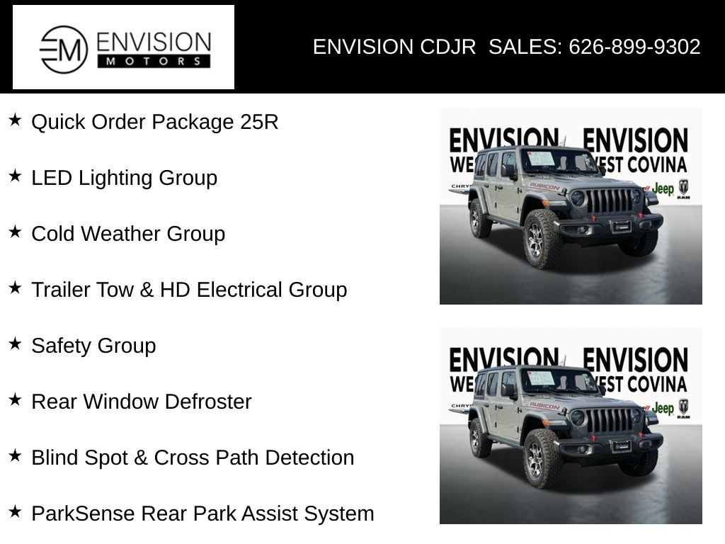 WE SPECIALIZE IN ALL CREDIT PROFILES! See what we can do for you! Call to find out (626) 899-9302.Certified. Clean CARFAX.240 Amp Alternator, 7 & 4 Pin Wiring Harness, 700 Amp Maintenance Free Battery, Auxiliary Switches, Black 3-Piece Hard Top, Blind Spot & Cross Path Detection, Body Color Fender Flares, Class II Receiver Hitch, Cold Weather Group, Daytime Running Lamps LED Accents, Freedom Panel Storage Bag, Front LED Fog Lamps, Heated Front Seats, Heated Steering Wheel, LED Lighting Group, LED Premium Reflector Headlamps, LED Taillamps, No Soft Top, ParkSense Rear Park Assist System, Quick Order Package 25R, Rear Window Defroster, Rear Window Wiper/Washer, Safety Group, Trailer Tow & HD Electrical Group, Wheels: 17" x 7.5" Machined w/Black Pockets.Sting-Gray Clearcoat2021 Jeep Wrangler Unlimited Rubicon 4WD 8-Speed Automatic 3.6L V6 24V VVTFCA US LLC Certified Pre-Owned Details: * Limited Warranty: 3 Month/3,000 Mile (whichever comes first) after new car warranty expires or from certified purchase date * 125 Point Inspection * Warranty Deductible: $100 * Vehicles Up to 75,000 Miles and/or 5 Model Years. 24-Hour Towing & Roadside Assistance, Car Rental Allowance, CARFAX® Vehicle History ReportTM and an Introductory 3-month Subscription to SiriusXM® Satellite Radio & Certified Warranty Upgrades * Transferable Warranty * Roadside Assistance * Powertrain Limited Warranty: 84 Month/100,000 Mile (whichever comes first) from original in-service date * Vehicle History**********All Pricing and Advertised Prices for any/all vehicles offered for sale does not include dealer installed accessories which can be purchased for an additional cost.********** The Factory Rebates may not be available on this vehicle if you elect to take advantage of a Special Alternative APR or Special Lease program. Some Factory Rebates are California Resident specific and may vary for residents of other states. NO sales to Dealers, Brokers or Exporters. For out of state purchase, customers must be present to purchase. If shipping is required, dealership must facilitate; no exceptions. Please contact us for special Multi-Vehicle or Fleet pricing. Prices are plus government fees and taxes, any finance charges, $85 documentary fee, $29 electronic registration fee, any emission testing charge and $1.75 per new tire state tire fee. *** We make every effort to provide accurate information, but please verify before purchasing. Leasing & financing available on approved credit. Trade-ins accepted. Subject to prior sale.