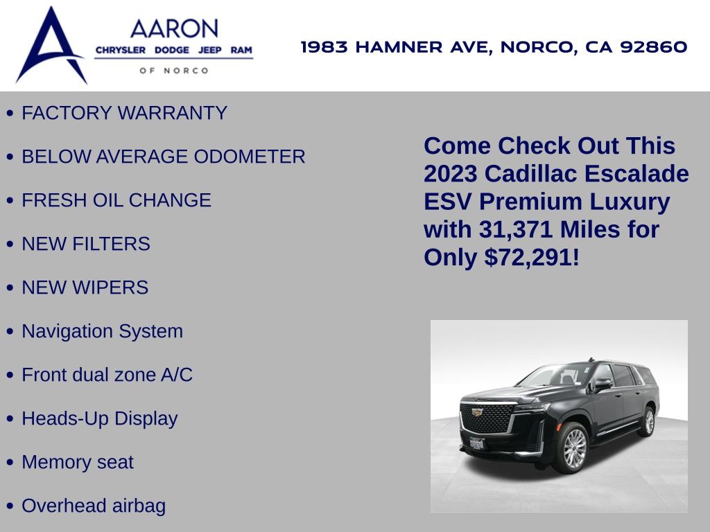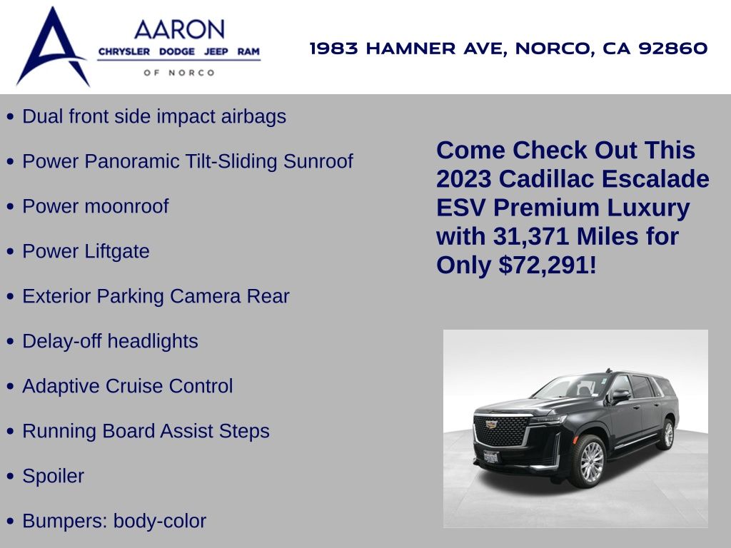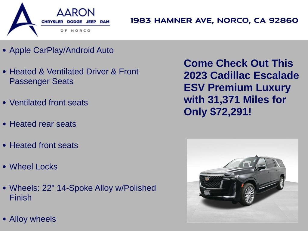 Priced below KBB Fair Purchase Price!FACTORY WARRANTY, BELOW AVERAGE ODOMETER, FRESH OIL CHANGE, NEW FILTERS, NEW WIPERS, Escalade ESV Premium, 4D Sport Utility, 6.2L V8, 10-Speed Automatic, AWD, Adaptive Cruise Control, Alloy wheels, Apple CarPlay/Android Auto, Bumpers: body-color, Delay-off headlights, Dual front side impact airbags, Exterior Parking Camera Rear, Front dual zone A/C, Heads-Up Display, Heated & Ventilated Driver & Front Passenger Seats, Heated front seats, Heated rear seats, Memory seat, Navigation System, Overhead airbag, Power Liftgate, Power moonroof, Power Panoramic Tilt-Sliding Sunroof, Running Board Assist Steps, Spoiler, Ventilated front seats, Wheel Locks, Wheels: 22" 14-Spoke Alloy w/Polished Finish.CARFAX One-Owner.