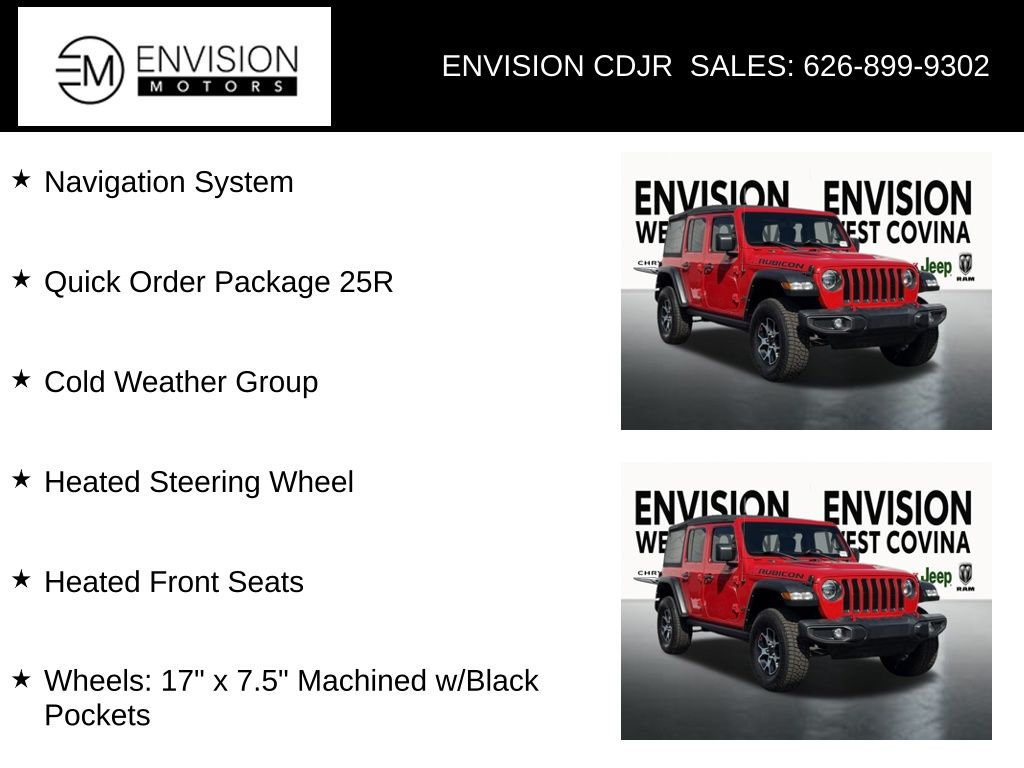 WE SPECIALIZE IN ALL CREDIT PROFILES! See what we can do for you! Call to find out (626) 899-9302.Certified. Clean CARFAX.Cold Weather Group, Heated Front Seats, Heated Steering Wheel, Navigation System, Quick Order Package 25R, Wheels: 17" x 7.5" Machined w/Black Pockets.Firecracker Red Clearcoat2022 Jeep Wrangler Unlimited Rubicon 4WD 8-Speed Automatic 3.6L V6 24V VVTFCA US LLC Certified Pre-Owned Details: * Vehicles Up to 75,000 Miles and/or 5 Model Years. 24-Hour Towing & Roadside Assistance, Car Rental Allowance, CARFAX® Vehicle History ReportTM and an Introductory 3-month Subscription to SiriusXM® Satellite Radio & Certified Warranty Upgrades * Transferable Warranty * 125 Point Inspection * Powertrain Limited Warranty: 84 Month/100,000 Mile (whichever comes first) from original in-service date * Warranty Deductible: $100 * Limited Warranty: 3 Month/3,000 Mile (whichever comes first) after new car warranty expires or from certified purchase date * Vehicle History * Roadside Assistance**********All Pricing and Advertised Prices for any/all vehicles offered for sale does not include dealer installed accessories which can be purchased for an additional cost.********** The Factory Rebates may not be available on this vehicle if you elect to take advantage of a Special Alternative APR or Special Lease program. Some Factory Rebates are California Resident specific and may vary for residents of other states. NO sales to Dealers, Brokers or Exporters. For out of state purchase, customers must be present to purchase. If shipping is required, dealership must facilitate; no exceptions. Please contact us for special Multi-Vehicle or Fleet pricing. Prices are plus government fees and taxes, any finance charges, $85 documentary fee, $29 electronic registration fee, any emission testing charge and $1.75 per new tire state tire fee. *** We make every effort to provide accurate information, but please verify before purchasing. Leasing & financing available on approved credit. Trade-ins accepted. Subject to prior sale.