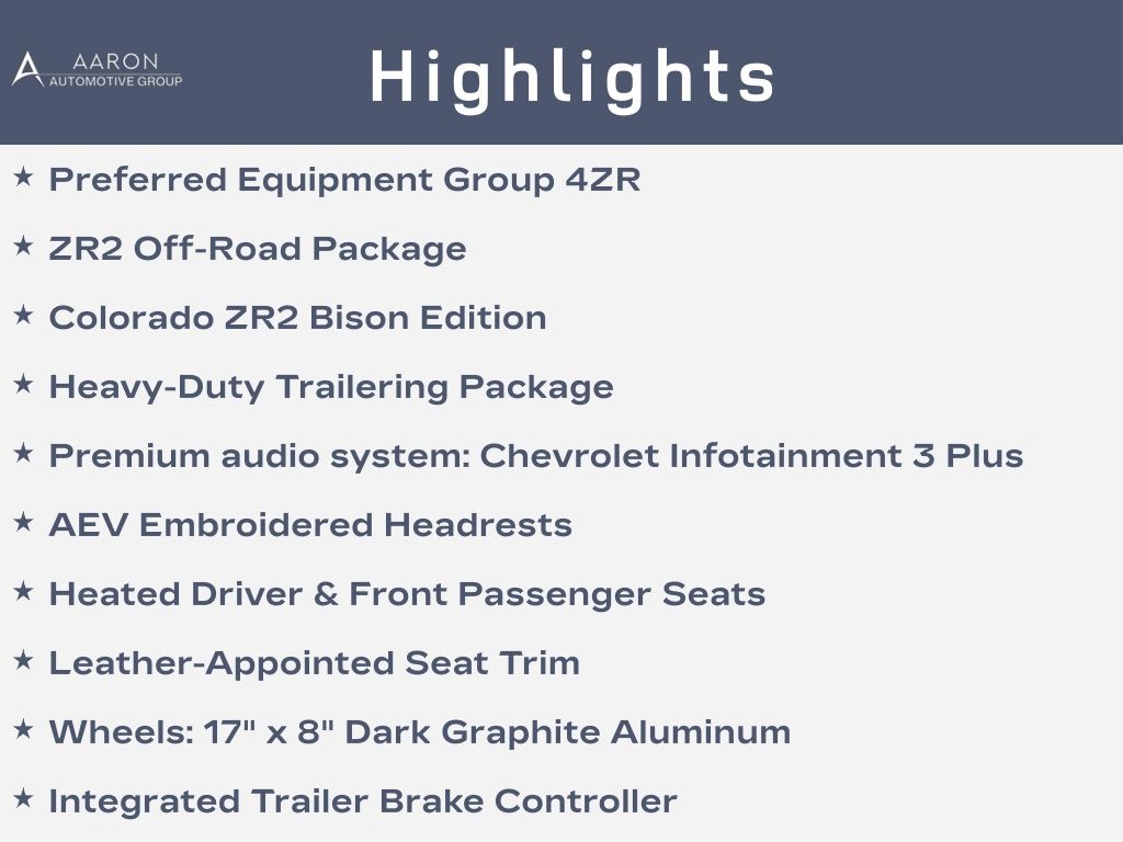 Satin Steel Metallic 2021 Chevrolet Colorado ZR2 4WD 8-Speed Automatic V6 4WD, AEV Embroidered Headrests, AEV Front Bumper, AEV Rear Bumper, Apple CarPlay/Android Auto, Black Rear Bumpers, Black Spray-On Bedliner w/Chevrolet Logo, Colorado ZR2 Bison Edition, Driver-Selectable Full-Locking Front Differential, Driver-Selectable Full-Locking Rear Differential, Exterior Parking Camera Rear, Front Contoured Floor Mats, Front Fog Lamps, Heated Driver & Front Passenger Seats, Heavy-Duty Trailering Package, Hitch Guidance, Integrated Trailer Brake Controller, Leather-Appointed Seat Trim, Preferred Equipment Group 4ZR, Premium audio system: Chevrolet Infotainment 3 Plus, Rear Contoured Floor Mats, Tow/Haul Mode, Wheel Moldings, Wheels: 17" x 8" Dark Graphite Aluminum, ZR2 Off-Road Package.Recent Arrival!