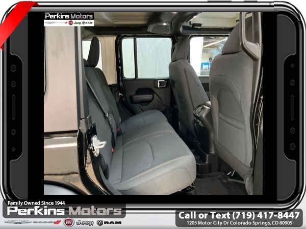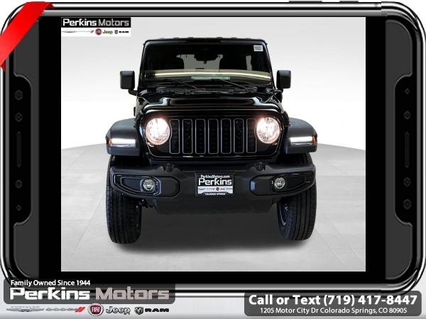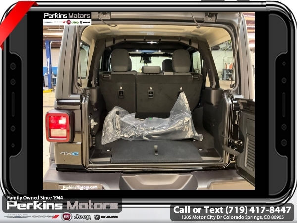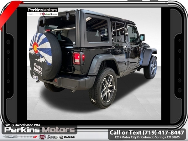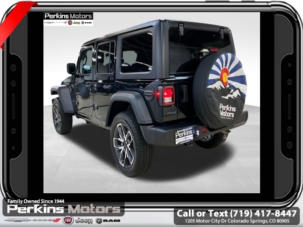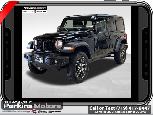 Factory MSRP: $57,245 $8,520 off MSRP! Priced below KBB Fair Purchase Price! Black Clearcoat 2025 Jeep Wrangler Sport S 4xe 4WD 8-Speed Automatic 2.0L I4 DOHC<br>2.0L I4 DOHC.<br>Check us out at www.perkinsmotors.com to see our specials! Since opening our doors in 1944, we’ve been proud to serve Colorado Springs, CO, and the surrounding areas of Pueblo, Castle Rock and Denver, CO. Throughout this time of being family owned for 80 years, we’ve maintained a firm commitment to our customers: to offer a wide selection of New Chrysler, Dodge, Fiat, Jeep, and Ram vehicles and quality pre-owned vehicles, and provide a quick, no-hassle car-buying process that ensures everyone drives off the lot satisfied with their purchase.<br><br>Convenience Group (2-Door Passive Entry, Front Door Locks, Air Conditioning w/Auto Temperature Control, Air Filtering, Emergency/Assistance Call, Heated Front Seats, Heated Steering Wheel, Remote Start System, and Universal Garage Door Opener), Quick Order Package 29U Sport S, 2.0L I4 DOHC, 3.73 Rear Axle Ratio, 4-Wheel Disc Brakes, 8 Speakers, ABS brakes, Air Conditioning, Alloy wheels, AM/FM radio: SiriusXM, Apple CarPlay/Android Auto, Black 3-Piece Hard Top, Brake assist, Cloth Low-Back Bucket Seats, Compass, Cruise Control, Delay-off headlights, Driver door bin, Driver vanity mirror, Dual front impact airbags, Dual front side impact airbags, Electronic Stability Control, Freedom Panel Storage Bag, Front anti-roll bar, Front Bucket Seats, Front Center Armrest w/Storage, Front fog lights, Front License Plate Bracket (DISC), Front reading lights, Fully automatic headlights, Heated door mirrors, Illuminated entry, Integrated roll-over protection, Low tire pressure warning, MOPAR All-Weather Floor Mats, Occupant sensing airbag, Outside temperature display, Overhead airbag, Panic alarm, ParkView Rear Back-Up Camera, Passenger door bin, Passenger vanity mirror, Power door mirrors, Power steering, Power windows, Radio data system, Radio: Uconnect 5 w/12.3 Display, Rear anti-roll bar, Rear reading lights, Rear Window Defroster, Rear Window Wiper/Washer, Remote keyless entry, Security system, Split folding rear seat, Sport Suspension, Steering wheel mounted audio controls, Tachometer, Telescoping steering wheel, Tilt steering wheel, Traction control, Trip computer, Variably intermittent wipers, Voltmeter, and Wheels: 20 x 8 Machined/Painted Gray. Sale price includes all manufacture's incentives and dealer discounts. Sale price not available on lease or compatible with special APR. $2000 - 2025 National Retail Consumer Cash. Exp. 06/02/2025