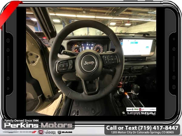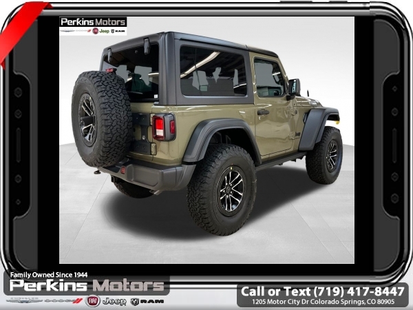 Factory MSRP: $55,510 $7,618 off MSRP! 41 2025 Jeep Wrangler Willys 4WD 8-Speed Automatic 2.0L I4 DOHC<br><br>Check us out at www.perkinsmotors.com to see our specials! Since opening our doors in 1944, we’ve been proud to serve Colorado Springs, CO, and the surrounding areas of Pueblo, Castle Rock and Denver, CO. Throughout this time of being family owned for 80 years, we’ve maintained a firm commitment to our customers: to offer a wide selection of New Chrysler, Dodge, Fiat, Jeep, and Ram vehicles and quality pre-owned vehicles, and provide a quick, no-hassle car-buying process that ensures everyone drives off the lot satisfied with their purchase.<br><br>Convenience Group (2-Door Passive Entry, Front Door Locks, Emergency/Assistance Call, and Heated Front Seats), Quick Order Package 22W Willys (4-Wheel Drive Swing Gate Decal, 4.10 Rear Axle Ratio, Conventional Differential Front Axle, Dana M210 Wide HD Tube Front Axle, Full Speed FWD Collison Warn Plus, Mold In Color Bumper w/Gloss Black, Molded in Color Rubicon Highline Flare, and Security Alarm), Xtreme 35 Tire Package (35 Tire Suspension, 4.56 Rear Axle Ratio, Dana M220 Wide Full Floating Rear Axle, MOPAR Hinge-Gate Reinforcement, Wheel Flare Extensions, and Wheels: 17 x 8.0 Machined w/Black Pockets), 110 MPH Vehicle Max Speed Calibration, 3.45 Overall Top Gear Ratio, 4-Wheel Disc Brakes, 8 Speakers, ABS brakes, Air Conditioning, Apple CarPlay/Android Auto, Auxiliary Battery, Black 3-Piece Hard Top, Brake assist, Cloth Low-Back Bucket Seats, Compass, Cruise Control, Delay-off headlights, Driver door bin, Driver vanity mirror, Dual front impact airbags, Dual front side impact airbags, Electronic Stability Control, Freedom Panel Storage Bag, Front anti-roll bar, Front Bucket Seats, Front Center Armrest w/Storage, Front fog lights, Front reading lights, Illuminated entry, Integrated roll-over protection, Jeep Trail Rated Kit, Low tire pressure warning, MOPAR Cargo Tub Liner, MOPAR Doors Off Mirror Kit, MOPAR Hardtop Headliner, MOPAR Plastic Door Sill Guards, Multi-Function Accessory Rail, Non-Locking Fuel Cap w/o Discriminator, Normal Duty Suspension, Occupant sensing airbag, Outside temperature display, Overhead airbag, Panic alarm, ParkView Rear Back-Up Camera, Passenger door bin, Passenger vanity mirror, Power steering, Power windows, Radio data system, Radio: Uconnect 5 w/12.3 Display, Rear anti-roll bar, Rear reading lights, Rear Window Defroster, Rear Window Wiper/Washer, Remote keyless entry, Steering wheel mounted audio controls, Stop-Start Dual Battery System, Tachometer, Telescoping steering wheel, Tilt steering wheel, Traction control, Trip computer, Variably intermittent wipers, and Wheels: 17 x 7.5 Black Steel Styled.