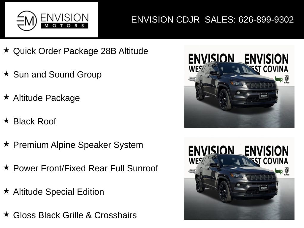 WE SPECIALIZE IN ALL CREDIT PROFILES! See what we can do for you! Call to find out (626) 899-9302.Certified. CARFAX One-Owner. Clean CARFAX.22/31 City/Highway MPG Altitude Package, Altitude Special Edition, Black Day Light Opening Moldings, Black Headliner, Black Roof, Bright Exhaust Tip, Gloss Black Badges, Gloss Black Grille & Crosshairs, Gloss Black Lower Rear Fascia Valance, Light Tungsten Interior Accent Stitching, Piano Black Interior Accents, Power Front/Fixed Rear Full Sunroof, Premium Alpine Speaker System, Quick Order Package 28B Altitude, Sun and Sound Group, Wheels: 18" x 7" Gloss Black Painted Aluminum.Granite Crystal Metallic Clearcoat2022 Jeep Compass Altitude FWD 6-Speed Aisin Automatic 2.4L I4FCA US LLC Certified Pre-Owned Details: * Powertrain Limited Warranty: 84 Month/100,000 Mile (whichever comes first) from original in-service date * Limited Warranty: 3 Month/3,000 Mile (whichever comes first) after new car warranty expires or from certified purchase date * Vehicles Up to 75,000 Miles and/or 5 Model Years. 24-Hour Towing & Roadside Assistance, Car Rental Allowance, CARFAX® Vehicle History ReportTM and an Introductory 3-month Subscription to SiriusXM® Satellite Radio & Certified Warranty Upgrades * 125 Point Inspection * Vehicle History * Transferable Warranty * Warranty Deductible: $100 * Roadside Assistance**********All Pricing and Advertised Prices for any/all vehicles offered for sale does not include dealer installed accessories which can be purchased for an additional cost.********** The Factory Rebates may not be available on this vehicle if you elect to take advantage of a Special Alternative APR or Special Lease program. Some Factory Rebates are California Resident specific and may vary for residents of other states. NO sales to Dealers, Brokers or Exporters. For out of state purchase, customers must be present to purchase. If shipping is required, dealership must facilitate; no exceptions. Please contact us for special Multi-Vehicle or Fleet pricing. Prices are plus government fees and taxes, any finance charges, $85 documentary fee, $29 electronic registration fee, any emission testing charge and $1.75 per new tire state tire fee. *** We make every effort to provide accurate information, but please verify before purchasing. Leasing & financing available on approved credit. Trade-ins accepted. Subject to prior sale.