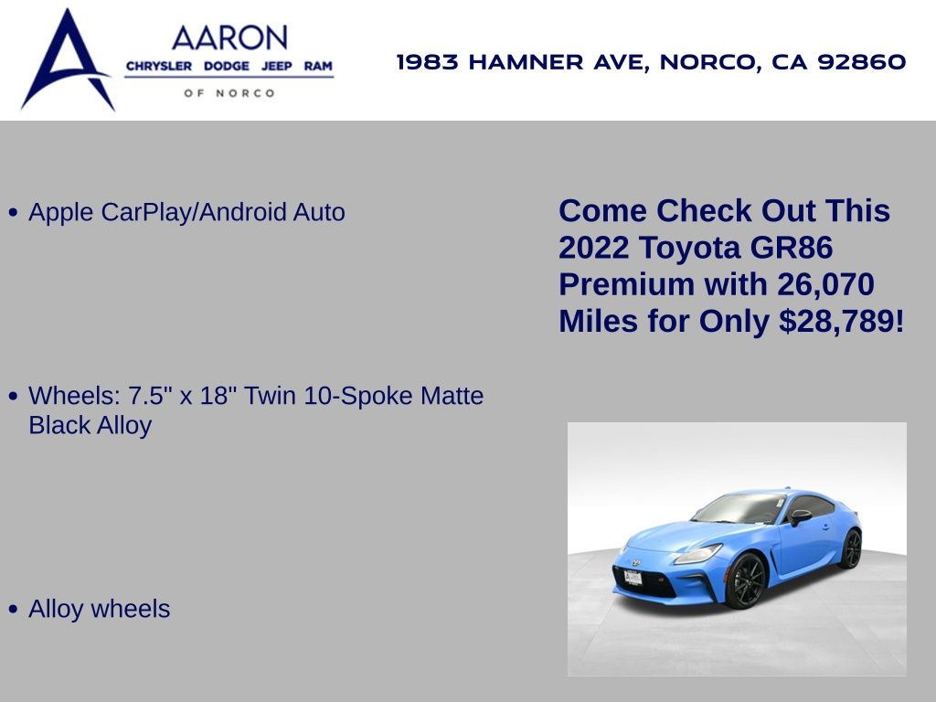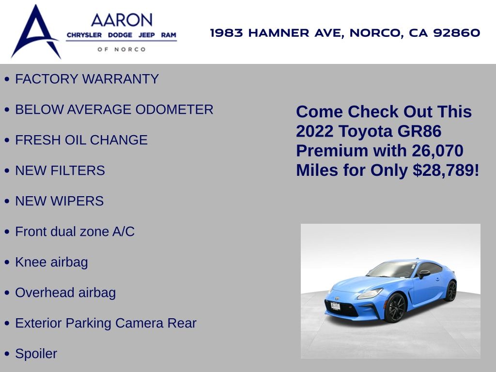 FACTORY WARRANTY, BELOW AVERAGE ODOMETER, FRESH OIL CHANGE, NEW FILTERS, NEW WIPERS, GR86 Premium, 2D Coupe, 2.4L I4 DOHC, 6-Speed Automatic ECT-i, RWD, Alloy wheels, Apple CarPlay/Android Auto, Exterior Parking Camera Rear, Front dual zone A/C, Knee airbag, Overhead airbag, Spoiler, Wheels: 7.5" x 18" Twin 10-Spoke Matte Black Alloy.CARFAX One-Owner.