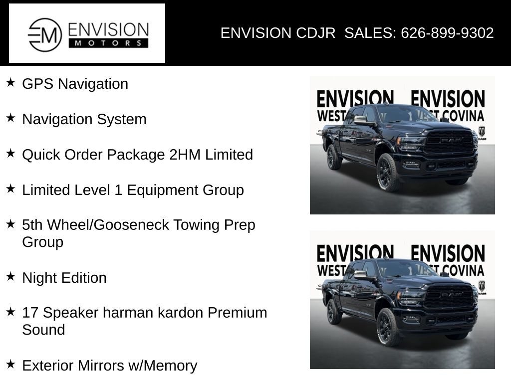 WE SPECIALIZE IN ALL CREDIT PROFILES! See what we can do for you! Call to find out (626) 899-9302.Certified.Odometer is 24680 miles below market average! 17 Speaker harman kardon Premium Sound, 5th Wheel/Gooseneck Towing Prep Group, Adaptive Cruise Control w/Stop, Adaptive Steering System, Black Exterior Mirrors, Black Exterior Truck Badging, Black Headlamp Bezels, Black Limited Grille, Black RAM Head Tailgate Badge, Black Tail Lamp Bezels, Black Wheel Center Hub, Body Color Door Handles, Body Color Grille Surround, Center Stop Lamp w/Cargo View Camera, Digital Rearview Mirror, Exterior Mirrors Courtesy Lamps, Exterior Mirrors w/Heating Element, Exterior Mirrors w/Memory, Exterior Mirrors w/Supplemental Signals, Full Speed Forward Collision Warning Plus, GPS Navigation, Lane Keep Assist, Limited Level 1 Equipment Group, Mirror Running Lights, Mirror-Mounted Aux Reverse Lamps, Navigation System, Night Edition, Painted Front Bumper, Painted Rear Bumper, Pickup Box, Power Adjustable Convex Aux Mirrors, Power Sunroof, Power-Folding Mirrors, Pwr Convenience Black Tow Mirrors w/Spotter & Memory, Quick Order Package 2HM Limited, Surround View Camera System, Tow Hooks, Trailer Reverse Guidance, Trailer Tow Mirrors, Vendor Painted Cargo Box, Vendor Painted Cargo Box Tracking, Wheels: 20" x 8.0" Cast Aluminum Black.Diamond Black Crystal Pearlcoat2022 Ram 2500 Limited 4WD 6-Speed Automatic Cummins 6.7L I6 TurbodieselFCA US LLC Certified Pre-Owned Details: * Vehicle History * Powertrain Limited Warranty: 84 Month/100,000 Mile (whichever comes first) from original in-service date * Vehicles Up to 75,000 Miles and/or 5 Model Years. 24-Hour Towing & Roadside Assistance, Car Rental Allowance, CARFAX® Vehicle History ReportTM and an Introductory 3-month Subscription to SiriusXM® Satellite Radio & Certified Warranty Upgrades * 125 Point Inspection * Transferable Warranty * Roadside Assistance * Limited Warranty: 3 Month/3,000 Mile (whichever comes first) after new car warranty expires or from certified purchase date * Warranty Deductible: $100**********All Pricing and Advertised Prices for any/all vehicles offered for sale does not include dealer installed accessories which can be purchased for an additional cost.********** The Factory Rebates may not be available on this vehicle if you elect to take advantage of a Special Alternative APR or Special Lease program. Some Factory Rebates are California Resident specific and may vary for residents of other states. NO sales to Dealers, Brokers or Exporters. For out of state purchase, customers must be present to purchase. If shipping is required, dealership must facilitate; no exceptions. Please contact us for special Multi-Vehicle or Fleet pricing. Prices are plus government fees and taxes, any finance charges, $85 documentary fee, $29 electronic registration fee, any emission testing charge and $1.75 per new tire state tire fee. *** We make every effort to provide accurate information, but please verify before purchasing. Leasing & financing available on approved credit. Trade-ins accepted. Subject to prior sale.