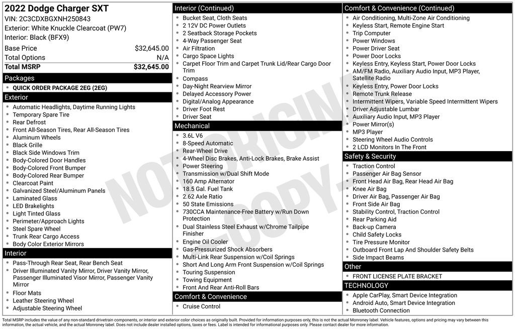 White Knuckle Clearcoat 2022 Dodge Charger SXT RWD 8-Speed Automatic 3.6L V6 SMPI DOHC 24V LEV II 292hp Black Cloth, Apple CarPlay/Android Auto, ParkView Rear Back-Up Camera, Quick Order Package 2EG, Remote keyless entry, Wheels: 17" x 7" Painted Cast Aluminum.Odometer is 1128 miles below market average! 19/30 City/Highway MPG