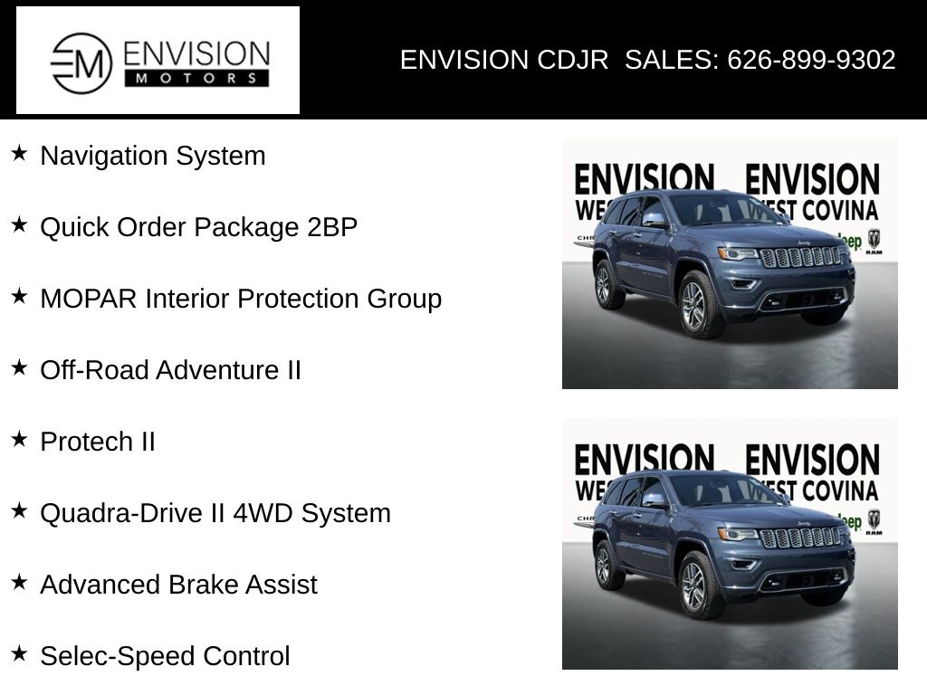 WE SPECIALIZE IN ALL CREDIT PROFILES! See what we can do for you! Call to find out (626) 899-9302.Certified. CARFAX One-Owner. Clean CARFAX.Odometer is 38608 miles below market average! 4WD, 230MM Rear Axle, Adaptive Cruise Control w/Stop, Advanced Brake Assist, Electronic Limited Slip Differential Rear Axle, Fuel Tank Skid Plate Shield, Full Speed FWD Collision Warn Plus, Lane Departure Warning Plus, MOPAR Cargo Area Liner, MOPAR Interior Protection Group, MOPAR Slush Mats, Navigation System, Normal Duty Suspension - Increased Travel, Off-Road Adventure II, Parallel & Perp Park Assist w/Stop, Power moonroof, Protech II, Quadra-Drive II 4WD System, Quick Order Package 2BP, Rain Sensitive Windshield Wipers, Selec-Speed Control, Steering Wheel Mounted Shift Control, Trail Rated Badge, Wheels: 18" x 8.0" Tech Gray Diamond Cut.Pacific Blue Clearcoat2021 Jeep Grand Cherokee Overland 4WD 8-Speed Automatic 3.6L V6 24V VVTFCA US LLC Certified Pre-Owned Details: * Transferable Warranty * Powertrain Limited Warranty: 84 Month/100,000 Mile (whichever comes first) from original in-service date * Limited Warranty: 3 Month/3,000 Mile (whichever comes first) after new car warranty expires or from certified purchase date * Vehicles Up to 75,000 Miles and/or 5 Model Years. 24-Hour Towing & Roadside Assistance, Car Rental Allowance, CARFAX® Vehicle History ReportTM and an Introductory 3-month Subscription to SiriusXM® Satellite Radio & Certified Warranty Upgrades * Warranty Deductible: $100 * Vehicle History * Roadside Assistance * 125 Point Inspection**********All Pricing and Advertised Prices for any/all vehicles offered for sale does not include dealer installed accessories which can be purchased for an additional cost.********** The Factory Rebates may not be available on this vehicle if you elect to take advantage of a Special Alternative APR or Special Lease program. Some Factory Rebates are California Resident specific and may vary for residents of other states. NO sales to Dealers, Brokers or Exporters. For out of state purchase, customers must be present to purchase. If shipping is required, dealership must facilitate; no exceptions. Please contact us for special Multi-Vehicle or Fleet pricing. Prices are plus government fees and taxes, any finance charges, $85 documentary fee, $29 electronic registration fee, any emission testing charge and $1.75 per new tire state tire fee. *** We make every effort to provide accurate information, but please verify before purchasing. Leasing & financing available on approved credit. Trade-ins accepted. Subject to prior sale.