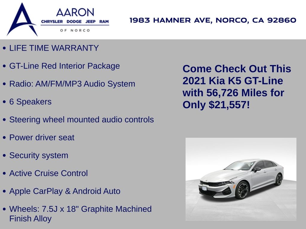 Priced below KBB Fair Purchase Price!LIFE TIME WARRANTY, 6 Speakers, Active Cruise Control, Apple CarPlay & Android Auto, GT-Line Red Interior Package, Power driver seat, Radio: AM/FM/MP3 Audio System, Security system, Steering wheel mounted audio controls, Wheels: 7.5J x 18" Graphite Machined Finish Alloy.