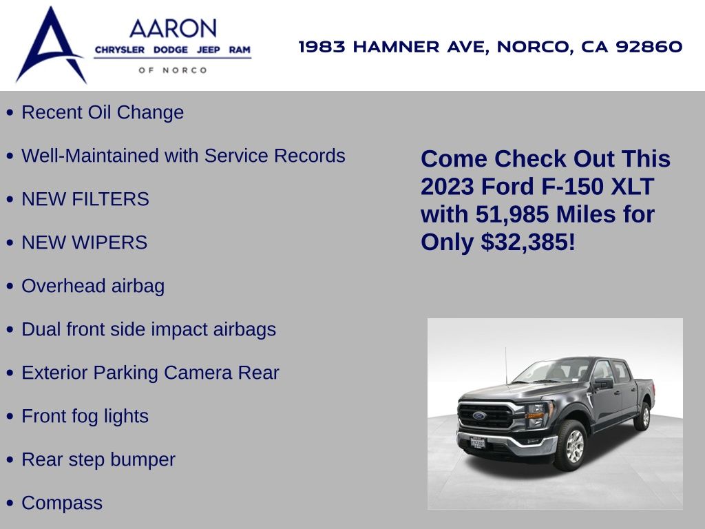 Built to handle hard work and ready for adventure, this 2023 Ford F-150 XLT SuperCrew 4x4 delivers legendary capability, advanced tech, and a versatile design thats prepared for everything from the jobsite to the weekend getaway. With 51,985 miles, a 1-owner Carfax history, minor cosmetic damage reported, and consistent service records, this well-maintained F-150 is priced to move and packed with value. Powered by the highly capable 3.5L V6 EcoBoost engine mated to a smooth 10-speed automatic transmission, this 4x4 truck delivers robust torque, impressive towing performance, and an EPA-estimated 20 MPG combined (18 city / 23 highway). Finished in Agate Black Metallic and equipped with the XLT Chrome Appearance Package, this F-150 features 18-inch chrome-like wheels, chrome bumpers, chrome step bars, and a black grille with chrome surround. The interior offers both comfort and durability with Baja Tan cloth 40/20/40 front bench seats, an 8-way power driver seat, tilt/telescoping steering column, rear privacy glass, and 120V power outlets both inside the cab and in the bed. Technology is front and center with SYNC 4, 8-inch touchscreen, Apple CarPlay, Android Auto, Wi-Fi hotspot, and FordPass Connect with remote start. Safety features include Pre-Collision Assist with Automatic Emergency Braking, BLIS with Cross-Traffic Alert, Reverse Sensing System, lane-keeping system, rearview camera with Dynamic Hitch Assist, and trailer sway control, offering confidence for towing or daily driving. This XLT also includes the FX4 Off-Road Package, front tow hooks, hill descent control, and selectable drive modes, adding rugged functionality when you need it most. Whether youre towing, commuting, or heading off-road, the F-150 remains Americas best-selling truck for a reasonit gets the job done. Dont miss this chance to own a proven performer with the versatility, reliability, and smart features todays drivers demandthis truck is ready when you are.