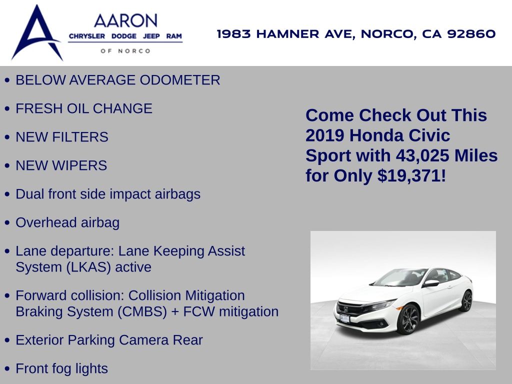 Priced below KBB Fair Purchase Price!BELOW AVERAGE ODOMETER, FRESH OIL CHANGE, NEW FILTERS, NEW WIPERS, Civic Sport, 2D Coupe, 2.0L I4 DOHC 16V i-VTEC, FWD, Black Cloth, Alloy wheels, Apple CarPlay/Android Auto, Dual front side impact airbags, Exterior Parking Camera Rear, Forward collision: Collision Mitigation Braking System (CMBS) + FCW mitigation, Front fog lights, Lane departure: Lane Keeping Assist System (LKAS) active, Overhead airbag.