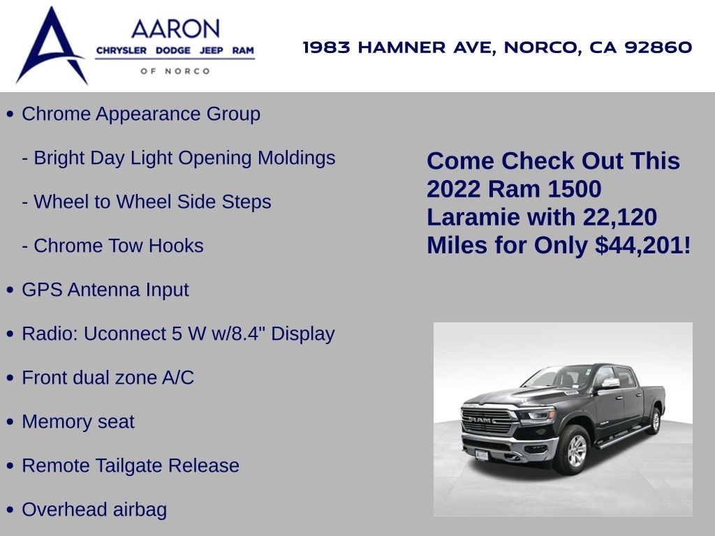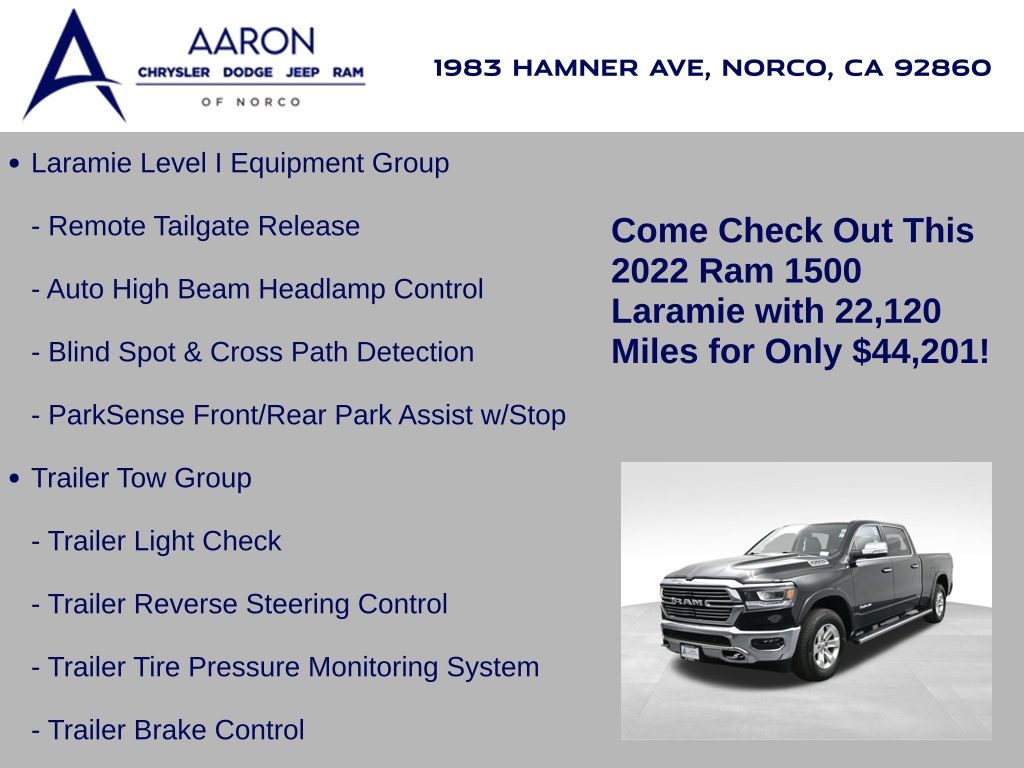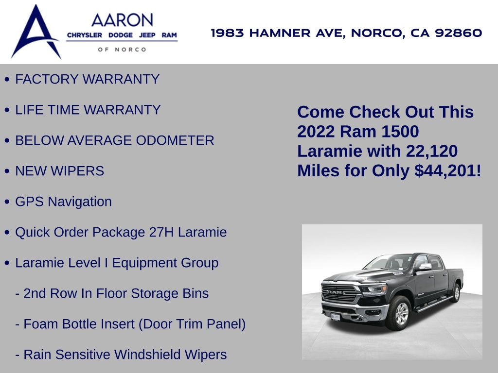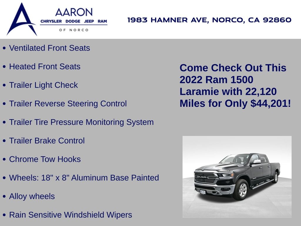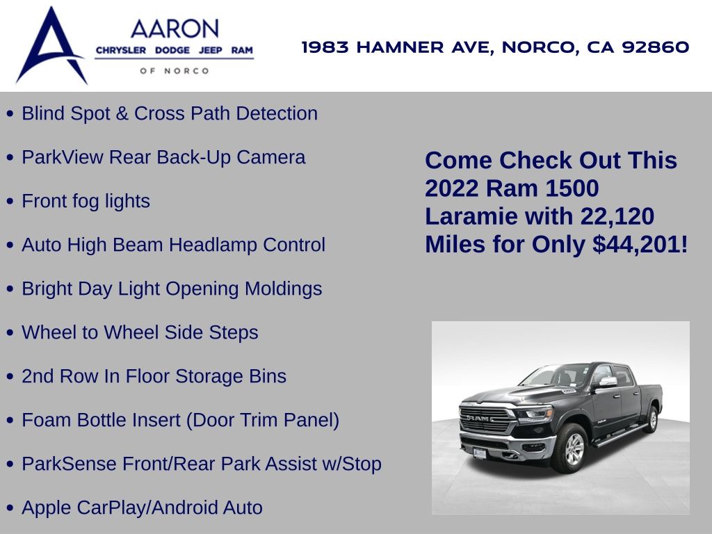 Priced below KBB Fair Purchase Price!FACTORY WARRANTY, LIFE TIME WARRANTY, BELOW AVERAGE ODOMETER, NEW WIPERS, 1500 Laramie, 4D Crew Cab, HEMI 5.7L V8 Multi Displacement VVT, 8-Speed Automatic, 4WD, 2nd Row In Floor Storage Bins, Alloy wheels, Apple CarPlay/Android Auto, Auto High Beam Headlamp Control, Blind Spot & Cross Path Detection, Bright Day Light Opening Moldings, Chrome Appearance Group, Chrome Tow Hooks, Dual front side impact airbags, Foam Bottle Insert (Door Trim Panel), Front dual zone A/C, Front fog lights, GPS Antenna Input, GPS Navigation, Heated Front Seats, Laramie Level I Equipment Group, Memory seat, Overhead airbag, ParkSense Front/Rear Park Assist w/Stop, ParkView Rear Back-Up Camera, Quick Order Package 27H Laramie, Radio: Uconnect 5 W w/8.4" Display, Rain Sensitive Windshield Wipers, Remote Tailgate Release, Trailer Brake Control, Trailer Light Check, Trailer Reverse Steering Control, Trailer Tire Pressure Monitoring System, Trailer Tow Group, Ventilated Front Seats, Wheel to Wheel Side Steps, Wheels: 18" x 8" Aluminum Base Painted.Clean CARFAX.CARFAX One-Owner.