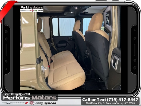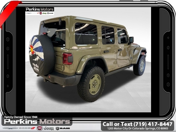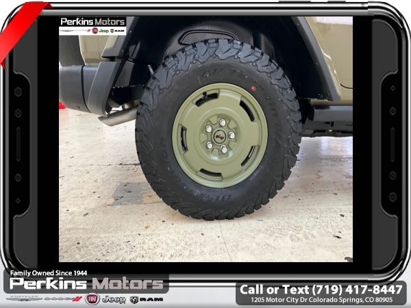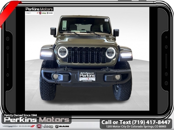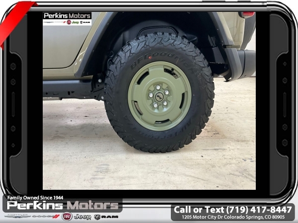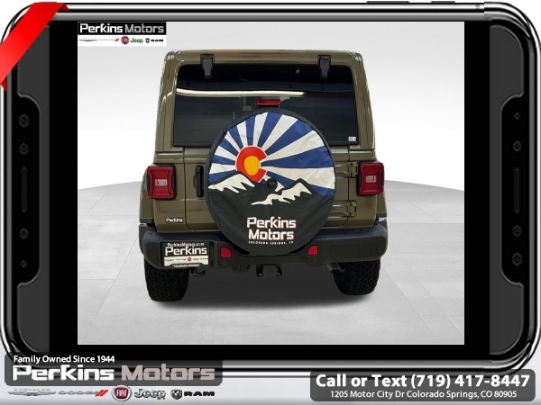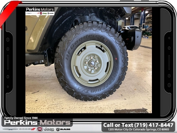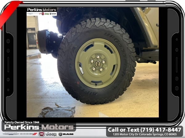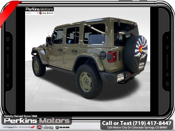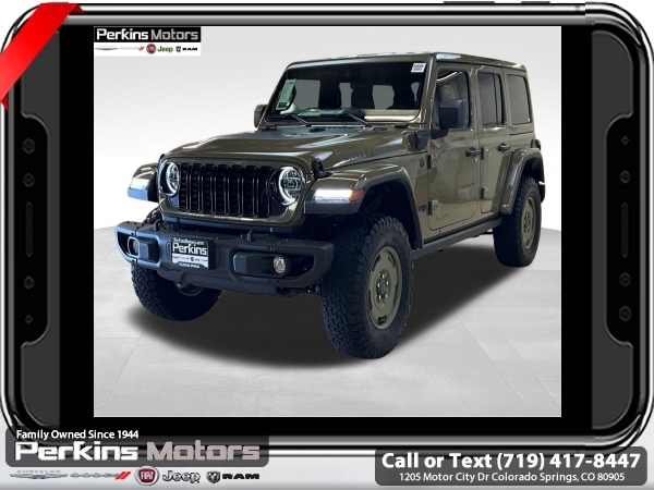 Factory MSRP: $69,900 $7,894 off MSRP! 41 2025 Jeep Wrangler Willys 4xe 4WD 8-Speed Automatic 2.0L I4 DOHC<br>2.0L I4 DOHC.<br>Check us out at www.perkinsmotors.com to see our specials! Since opening our doors in 1944, we’ve been proud to serve Colorado Springs, CO, and the surrounding areas of Pueblo, Castle Rock and Denver, CO. Throughout this time of being family owned for 80 years, we’ve maintained a firm commitment to our customers: to offer a wide selection of New Chrysler, Dodge, Fiat, Jeep, and Ram vehicles and quality pre-owned vehicles, and provide a quick, no-hassle car-buying process that ensures everyone drives off the lot satisfied with their purchase.<br><br>Convenience Group (2-Door Passive Entry, Front Door Locks, Air Conditioning w/Auto Temperature Control, Air Filtering, Emergency/Assistance Call, Heated Front Seats, Heated Steering Wheel, Remote Start System, and Universal Garage Door Opener), Quick Order Package 29H Willys '41 4xe (4.10 Rear Axle Ratio, 4xe 4WD Willys '41 Swing Gate Decal, 7 & 4 Pin Wiring Harness, 97 MPH Vehicle Max Speed Calibration, Auxiliary Switches, Body Color Grille w/Gloss Black Rings, Body Color Rubicon Highline Flare, Class II Receiver Hitch, Cloth Low-Back Bucket Seats (D7), Conventional Differential Front Axle, E-Locker Rear Axle, Front LED Fog Lamps, Gray/Black Trail Rated Badge, LED Premium Reflector Headlamps, Matte Black Jeep Badge, MOPAR All-Weather Floor Mats, Off-Road Plus Mode, Premium Tan Sunrider Soft Top (STC), Steel Front Bumper, Steel Rear Bumper, Wheels: 17 x 7.5 Painted Body Color, Willy's Suspension, Willys '41 Retro Edition Buzz Model, Willys '41 Retro Edition Hood Decal, Willys '41 Retro Edition PHEV Decal, Willys '41 Retro Edition Tailgate Plaque, Willys '41 Retro Edition Wrangler Decal, Willys '41 Retro Shift Bezel Insert, and Willys '41 US Edition U.S Hood Decal), Safety Group (Auto High Beam Headlamp Control, Blind Spot & Cross Path Detection, LED Taillamps, and ParkSense Rear Park Assist System), Technology Group (A/C Power Box Inverter (PHEV), Alpine Premium Audio System, and EV/PHEV Vehicle To Load), 2.0L I4 DOHC, 3.73 Rear Axle Ratio, 4-Wheel Disc Brakes, 8 Speakers, ABS brakes, Air Conditioning, Alloy wheels, AM/FM radio: SiriusXM, Apple CarPlay/Android Auto, Body Color 3-Piece Hard Top, Brake assist, Cloth Low-Back Bucket Seats, Compass, Cruise Control, Delay-off headlights, Driver door bin, Driver vanity mirror, Dual front impact airbags, Dual front side impact airbags, Electronic Stability Control, Freedom Panel Storage Bag, Front anti-roll bar, Front Bucket Seats, Front Center Armrest w/Storage, Front fog lights, Front License Plate Bracket (DISC), Front reading lights, Fully automatic headlights, Heated door mirrors, Illuminated entry, Integrated roll-over protection, Low tire pressure warning, Occupant sensing airbag, Outside temperature display, Overhead airbag, Panic alarm, ParkView Rear Back-Up Camera, Passenger door bin, Passenger vanity mirror, Power door mirrors, Power steering, Power windows, Radio data system, Radio: Uconnect 5 w/12.3 Display, Rear anti-roll bar, Rear reading lights, Rear Window Defroster, Rear Window Wiper/Washer, Remote keyless entry, Security system, Split folding rear seat, Sport Suspension, Steering wheel mounted audio controls, Tachometer, Telescoping steering wheel, Tilt steering wheel, Traction control, Trip computer, Variably intermittent wipers, Voltmeter, and Wheels: 20 x 8 Machined/Painted Gray. Sale price includes all manufacture's incentives and dealer discounts. Sale price not available on lease or compatible with special APR. $2000 - 2025 National Retail Consumer Cash. Exp. 06/30/2025 $3500 - Colorado Innovative Motor Vehicle Retail Credit. Exp. 12/31/2025