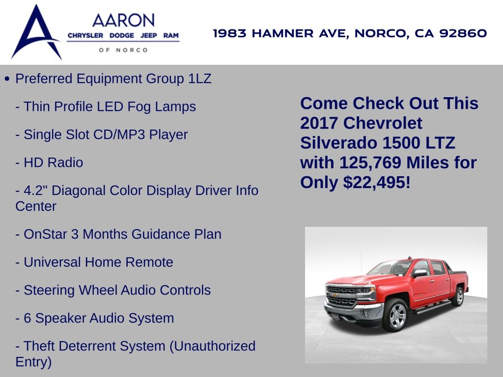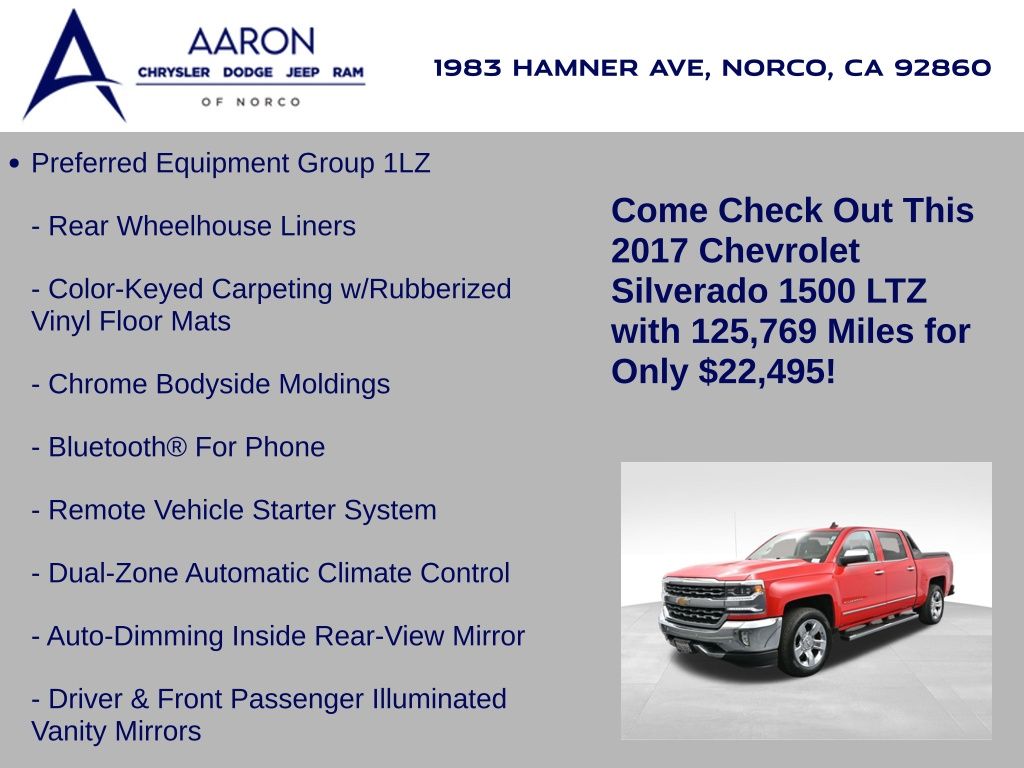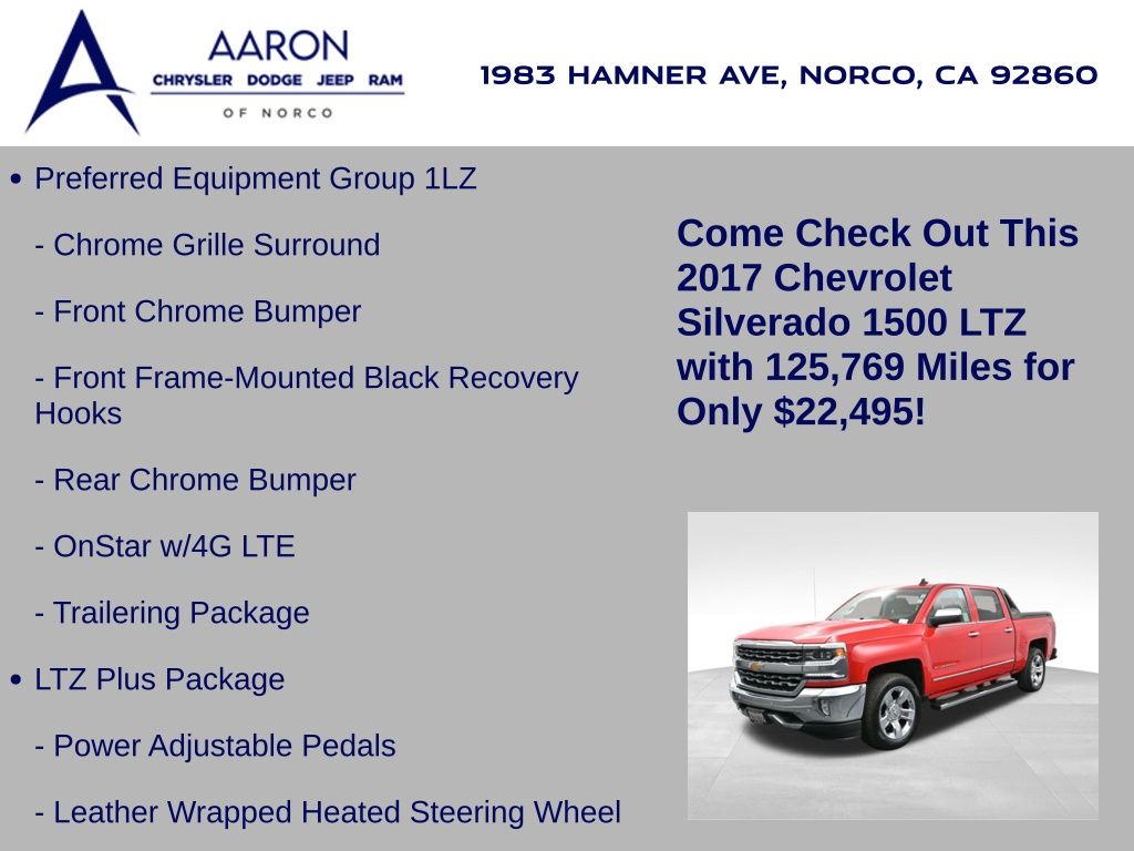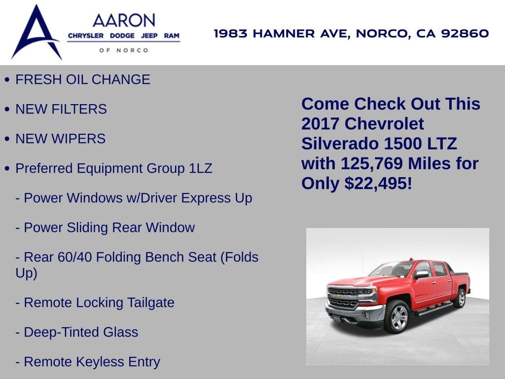 Priced below KBB Fair Purchase Price!FRESH OIL CHANGE, NEW FILTERS, NEW WIPERS, Silverado 1500 LTZ 1LZ, 4D Crew Cab, EcoTec3 5.3L V8, 6-Speed Automatic Electronic with Overdrive, 4WD, 110-Volt AC Power Outlet, 150 Amp Alternator, 4.2" Diagonal Color Display Driver Info Center, 6 Speaker Audio System, Alloy wheels, Auto-Dimming Inside Rear-View Mirror, Auxiliary External Transmission Oil Cooler, Bluetooth® For Phone, Chrome Bodyside Moldings, Chrome Cap Power-Adjustable Heated Outside Mirrors, Chrome Door Handles, Chrome Grille Surround, Chrome Mirror Caps, Color-Keyed Carpeting w/Rubberized Vinyl Floor Mats, Deep-Tinted Glass, Driver & Front Passenger Illuminated Vanity Mirrors, Dual front side impact airbags, Dual-Zone Automatic Climate Control, Electric Rear-Window Defogger, Exterior Parking Camera Rear, EZ Lift & Lower Tailgate, Front Chrome Bumper, Front dual zone A/C, Front fog lights, Front Frame-Mounted Black Recovery Hooks, HD Radio, Heated & Vented Front Seating, Heavy-Duty Rear Locking Differential, Leather Wrapped Heated Steering Wheel, Leather Wrapped Steering Wheel w/Cruise Controls, LED Taillamps w/Signature, LTZ Plus Package, Manual Tilt/Telescoping Steering Column, OnStar 3 Months Guidance Plan, OnStar w/4G LTE, Overhead airbag, Power Adjustable Pedals, Power Sliding Rear Window, Power Sunroof, Power Windows w/Driver Express Up, Preferred Equipment Group 1LZ, Rear 60/40 Folding Bench Seat (Folds Up), Rear Chrome Bumper, Rear Vision Camera, Rear Wheelhouse Liners, Remote Keyless Entry, Remote Locking Tailgate, Remote Vehicle Starter System, Single Slot CD/MP3 Player, Steering Wheel Audio Controls, Theft Deterrent System (Unauthorized Entry), Thin Profile LED Fog Lamps, Trailering Package, Universal Home Remote.Clean CARFAX.CARFAX One-Owner.Awards: * 2017 KBB.com 10 Most Awarded Brands