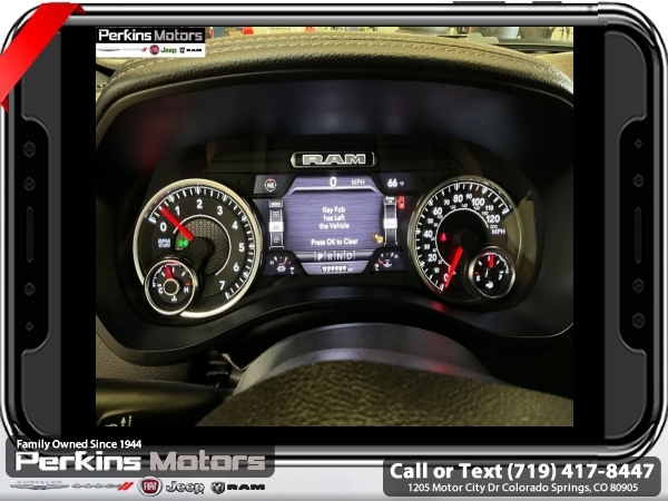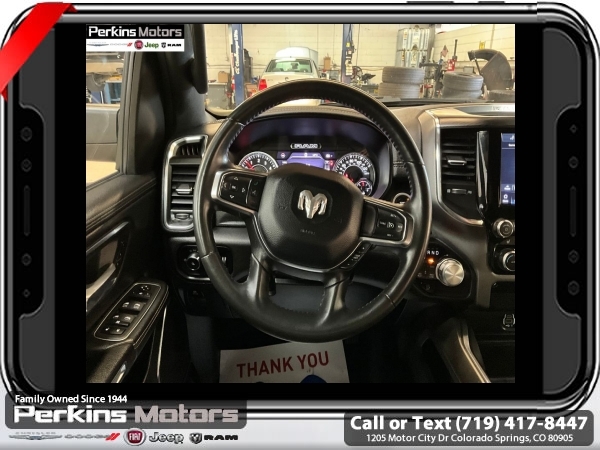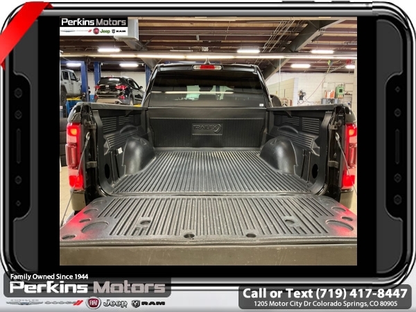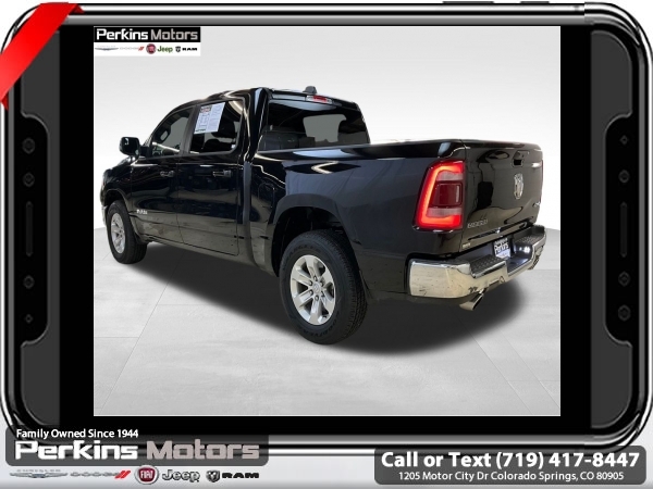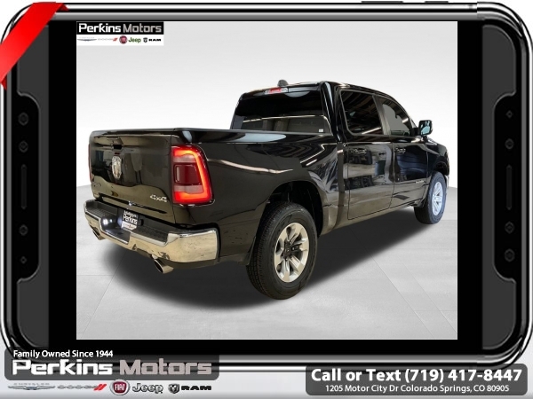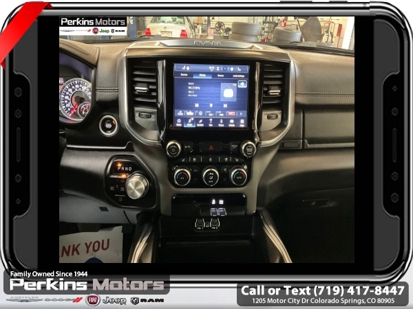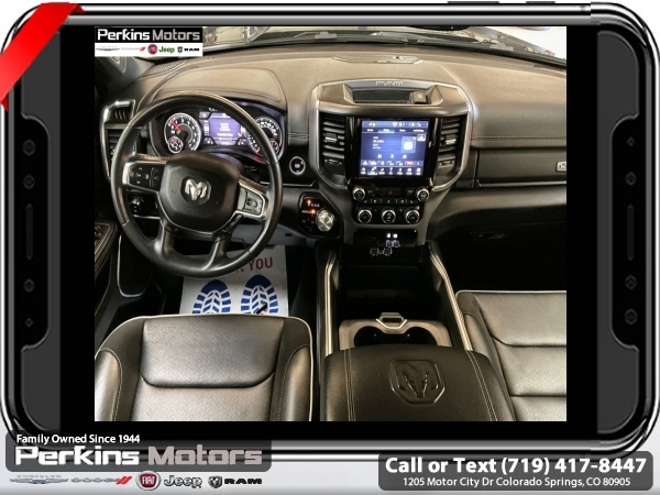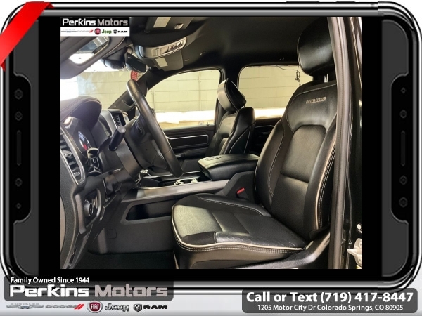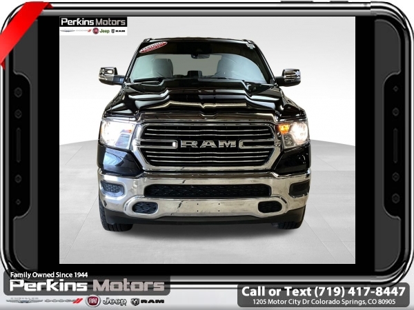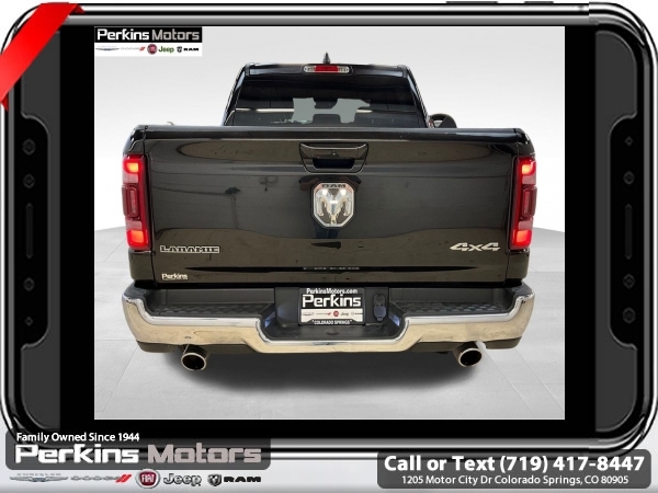 Diamond Black Crystal Pearlcoat 4WD HEMI 5.7L V8 Multi Displacement VVT eTorque 8-Speed Automatic<br><br><br>CARFAX One-Owner. Clean CARFAX.<br><br>Check us out at www.perkinsmotors.com to see our specials! Since opening our doors in 1944, we’ve been proud to serve Colorado Springs, CO, and the surrounding areas of Pueblo, Castle Rock and Denver, CO. Throughout this time of being family owned for 80 years, we’ve maintained a firm commitment to our customers: to offer a wide selection of New Chrysler, Dodge, Fiat, Jeep, and Ram vehicles and quality pre-owned vehicles, and provide a quick, no-hassle car-buying process that ensures everyone drives off the lot satisfied with their purchase.<br><br><br>Quick Order Package 27H Laramie, 10 Speakers, 3 Rear Seat Head Restraints, 3.21 Rear Axle Ratio, 4 Way Front Headrests, 4-Wheel Disc Brakes, 48V Belt Starter Generator, 4G LTE Wi-Fi Hot Spot, ABS brakes, Air Conditioning, Alloy wheels, AM/FM radio: SiriusXM with 360L, Apple CarPlay, Apple CarPlay/Android Auto, Audio memory, Auto-dimming door mirrors, Auto-Dimming Exterior Driver Mirror, Auto-dimming Rear-View mirror, Automatic temperature control, Brake assist, Bumpers: chrome, Chrome Exterior Mirrors, Compass, Connected Travel & Traffic Services, Connectivity - US/Canada, Convex Wide-Angle Exterior Mirror Insert, Cruise Control, Delay-off headlights, Driver door bin, Driver Seat Memory, Driver vanity mirror, Dual front impact airbags, Dual front side impact airbags, Electronic Stability Control, Exterior Mirrors Courtesy Lamps, Exterior Mirrors w/Heating Element, Exterior Mirrors w/Memory, Exterior Mirrors w/Supplemental Signals, For Details, Visit DriveUconnect.com, For More Info, Call 800-643-2112, Front anti-roll bar, Front Center Armrest w/Storage, Front dual zone A/C, Front fog lights, Front License Plate Bracket, Front reading lights, Front Seat Back Map Pockets, Front wheel independent suspension, Fully automatic headlights, Garage door transmitter, Global Telematics Box Module (TBM), Google Android Auto, GPS Navigation, HD Radio, Heated door mirrors, Heated Front Seats, Heated front seats, Heated Steering Wheel, Heated steering wheel, Illuminated entry, Integrated Voice Command w/Bluetooth, Leather steering wheel, Leather Trim 40/20/40 Bench Seat, Low tire pressure warning, Manufacturer's Statement of Origin, Memory seat, Navigation System, Occupant sensing airbag, Outside temperature display, Overhead airbag, Overhead console, Panic alarm, ParkView Rear Back-Up Camera, Passenger door bin, Passenger vanity mirror, Power 2-Way Driver Lumbar Adjust, Power 2-Way Passenger Lumbar Adjust, Power 8-Way Driver & Passenger Seats, Power door mirrors, Power driver seat, Power passenger seat, Power steering, Power windows, Power-Folding Mirrors, Radio data system, Radio: Uconnect 5 Nav w/8.4 Display, RAM Grille Badge - Chrome, Rear 60/40 Folding Seat, Rear anti-roll bar, Rear seat center armrest, Rear step bumper, Remote keyless entry, Security system, SiriusXM Radio Service, SiriusXM w/360L, Split folding rear seat, Steering wheel mounted audio controls, Tachometer, Telescoping steering wheel, Tilt steering wheel, Traction control, Trip computer, Turn signal indicator mirrors, USB Host Flip, Variably intermittent wipers, Ventilated Front Seats, Ventilated front seats, Voltmeter, and Wheels: 18 x 8 Aluminum Base PainteD.