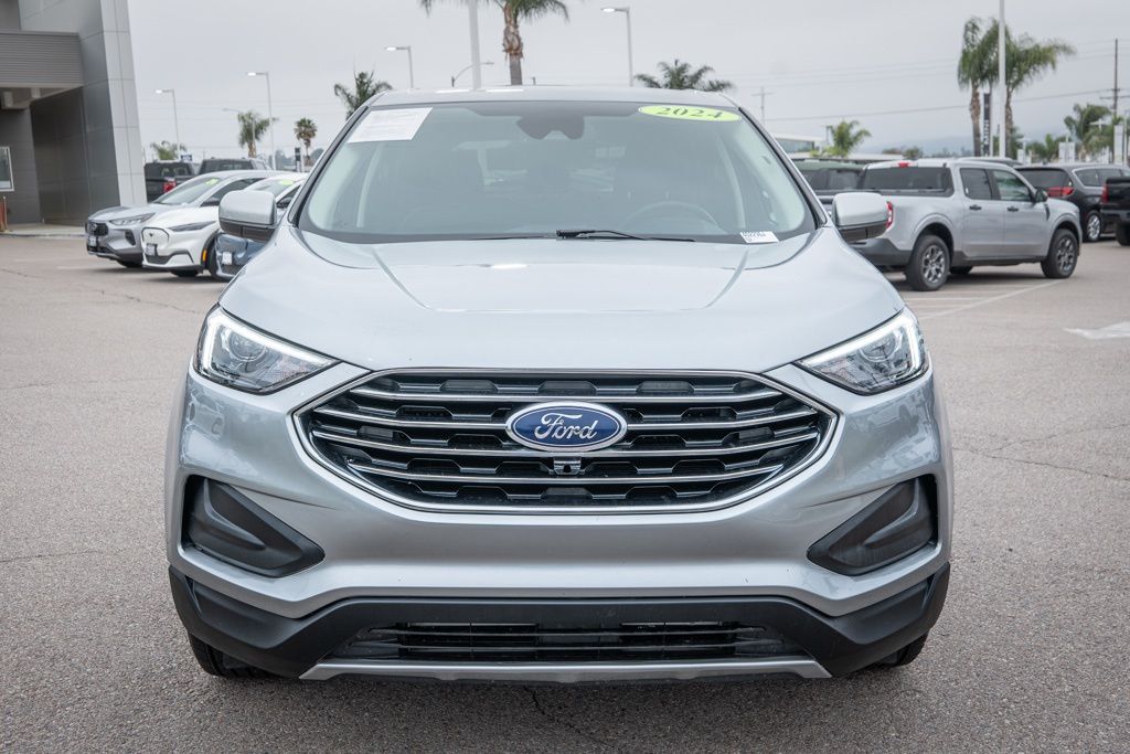 Silver Metallic 2024 Ford Edge SEL AWD 8-Speed Automatic EcoBoost 2.0L I4 GTDi DOHC Turbocharged VCT AWD, 6 Speakers, Alloy wheels, Auto High-beam Headlights, Automatic temperature control, Equipment Group 201A, Front Bucket Seats, Front dual zone A/C, Heated front seats, Leather steering wheel, Leather-Wrapped Steering Wheel, Outside temperature display, Power passenger seat, SiriusXM w/360L, Split folding rear seat, SYNC 4A w/Enhanced Voice Recognition, Wheels: 18" Sparkle Silver-Painted Aluminum.21/28 City/Highway MPG