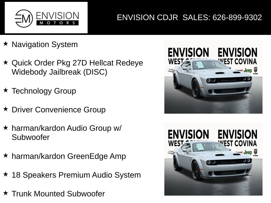 WE SPECIALIZE IN ALL CREDIT PROFILES! See what we can do for you! Call to find out (626) 899-9302.Clean CARFAX.Odometer is 1477 miles below market average! 18 Speakers Premium Audio System, 220 MPH Primary Speedometer, ABS brakes, Alloy wheels, Auto High Beam Headlamp Control, Black Seat Belts, Blind Spot & Cross Path Detection, Body Color Exterior Mirrors, Compass, Driver Convenience Group, Electronic Stability Control, Exterior Mirrors w/Heating Element, Front dual zone A/C, harman/kardon Audio Group w/Subwoofer, harman/kardon GreenEdge Amp, Heated door mirrors, Heated Front Seats, Heated front seats, High Performance Engine Controller, High-Intensity Discharge Headlamps, Illuminated entry, Jailbreak IP Badge, Low tire pressure warning, Navigation System, ParkView Rear Back-Up Camera, Power Multi-Function Foldaway Mirrors, Power Sunroof, Quick Order Pkg 27D Hellcat Redeye Widebody Jailbreak (DISC), Rain Sensitive Windshield Wipers, Redeye Badging, Remote keyless entry, SRT Power Chiller, Surround Sound, Technology Group, Traction control, Trunk Mounted Subwoofer, Wheels: 20" x 11.0" Carbon Black Lightweight, Wheels: 20" x 9.5" Low Gloss Black Drag, Widebody Competition Suspension, Widebody Fender Flares.Triple Nickel Clearcoat2023 Dodge Challenger SRT Hellcat Redeye Widebody Jailbreak RWD 8-Speed Automatic 6.2L 8-Cylinder SMPI Supercharged OHV**********All Pricing and Advertised Prices for any/all vehicles offered for sale does not include dealer installed accessories which can be purchased for an additional cost.********** The Factory Rebates may not be available on this vehicle if you elect to take advantage of a Special Alternative APR or Special Lease program. Some Factory Rebates are California Resident specific and may vary for residents of other states. NO sales to Dealers, Brokers or Exporters. For out of state purchase, customers must be present to purchase. If shipping is required, dealership must facilitate; no exceptions. Please contact us for special Multi-Vehicle or Fleet pricing. Prices are plus government fees and taxes, any finance charges, $85 documentary fee, $29 electronic registration fee, any emission testing charge and $1.75 per new tire state tire fee. *** We make every effort to provide accurate information, but please verify before purchasing. Leasing & financing available on approved credit. Trade-ins accepted. Subject to prior sale.