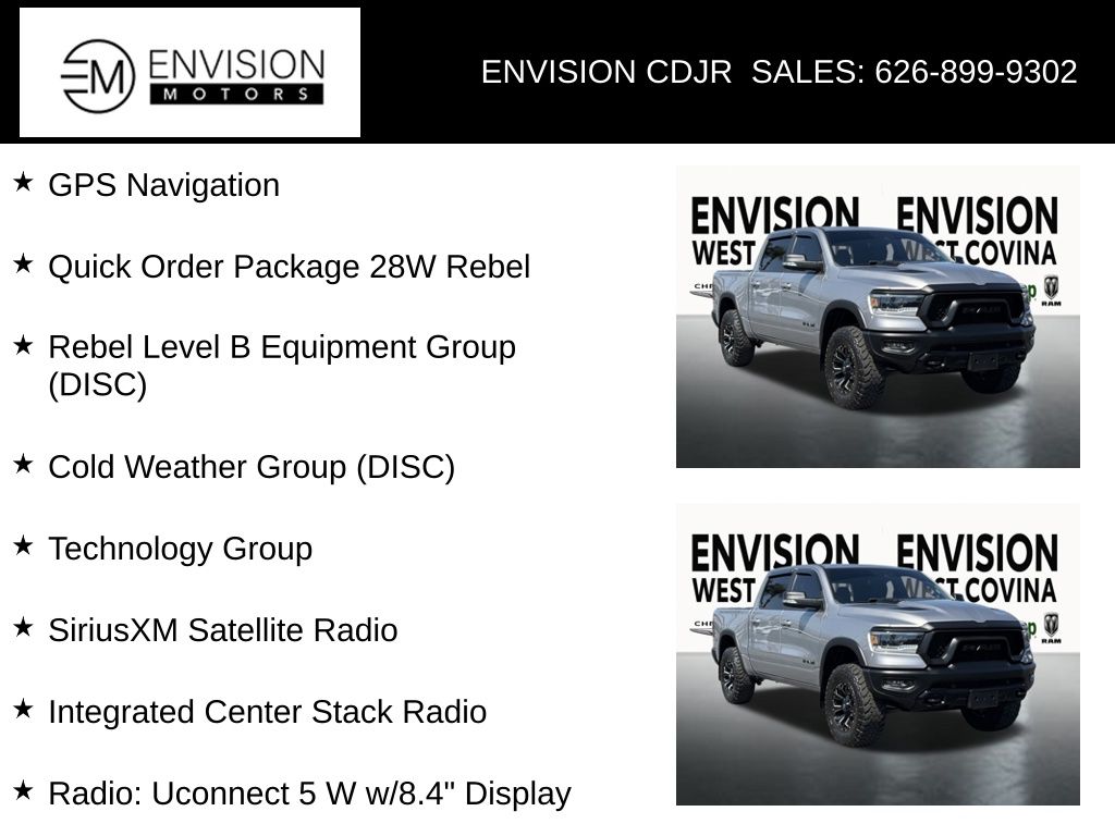 WE SPECIALIZE IN ALL CREDIT PROFILES! See what we can do for you! Call to find out (626) 899-9302.Certified.Odometer is 6738 miles below market average! 21/29 City/Highway MPG 115V Auxiliary Rear Power Outlet, 2-Door Passive Entry, Front Door Locks, 4G LTE Wi-Fi Hot Spot, 8.4" Touchscreen Display, Air Conditioning ATC w/Dual Zone Control, Apple CarPlay, Auto-Dimming Exterior Driver Mirror, Black Premium Power Mirrors (GUL), Bluetooth Handsfree Phone & Audio, Body Color Door Handles, Cold Weather Group (DISC), Connectivity - US/Canada, Digital Rearview Mirror, Engine Block Heater, Exterior Mirrors Courtesy Lamps, Exterior Mirrors w/Supplemental Signals, Foam Bottle Insert (Door Trim Panel), For More Info, Call 800-643-2112, Google Android Auto, GPS Navigation, Heads-Up Display, Heated Front Seats, Heated Steering Wheel, Integrated Center Stack Radio, LED CHMSL Lamp, Media Hub w/2 Charge Only USBs, MOPAR Winter Front Grille Cover, ParkSense Front/Rear Park Assist w/Stop, Power Adjustable Pedals, Quick Order Package 28W Rebel, Radio: Uconnect 5 W w/8.4" Display, Rain Sensitive Windshield Wipers, Rear Dome w/On/Off Switch Lamp, Rear Underseat Compartment Storage, Rear Window Defroster, Rebel Level B Equipment Group (DISC), Remote Start System, Security Alarm, SiriusXM Radio Service, SiriusXM Satellite Radio, Sun Visors w/Illuminated Vanity Mirrors, Technology Group, Universal Garage Door Opener, USB Host Flip.Billet Silver Metallic Clearcoat2022 Ram 1500 Rebel 4WD 8-Speed Automatic EcoDiesel 3.0L V6FCA US LLC Certified Pre-Owned Details: * Vehicle History * Vehicles Up to 75,000 Miles and/or 5 Model Years. 24-Hour Towing & Roadside Assistance, Car Rental Allowance, CARFAX® Vehicle History ReportTM and an Introductory 3-month Subscription to SiriusXM® Satellite Radio & Certified Warranty Upgrades * Powertrain Limited Warranty: 84 Month/100,000 Mile (whichever comes first) from original in-service date * Warranty Deductible: $100 * Limited Warranty: 3 Month/3,000 Mile (whichever comes first) after new car warranty expires or from certified purchase date * Transferable Warranty * 125 Point Inspection * Roadside Assistance**********All Pricing and Advertised Prices for any/all vehicles offered for sale does not include dealer installed accessories which can be purchased for an additional cost.********** The Factory Rebates may not be available on this vehicle if you elect to take advantage of a Special Alternative APR or Special Lease program. Some Factory Rebates are California Resident specific and may vary for residents of other states. NO sales to Dealers, Brokers or Exporters. For out of state purchase, customers must be present to purchase. If shipping is required, dealership must facilitate; no exceptions. Please contact us for special Multi-Vehicle or Fleet pricing. Prices are plus government fees and taxes, any finance charges, $85 documentary fee, $29 electronic registration fee, any emission testing charge and $1.75 per new tire state tire fee. *** We make every effort to provide accurate information, but please verify before purchasing. Leasing & financing available on approved credit. Trade-ins accepted. Subject to prior sale.