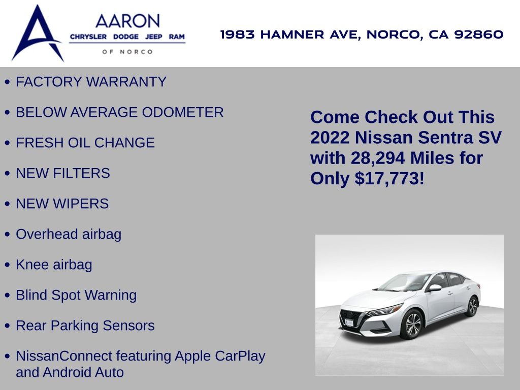 Priced below KBB Fair Purchase Price!FACTORY WARRANTY, BELOW AVERAGE ODOMETER, FRESH OIL CHANGE, NEW FILTERS, NEW WIPERS, Sentra SV, 4D Sedan, 2.0L DOHC, CVT with Xtronic, FWD, Alloy wheels, Blind Spot Warning, Knee airbag, NissanConnect featuring Apple CarPlay and Android Auto, Overhead airbag, Rear Parking Sensors.Clean CARFAX.CARFAX One-Owner.