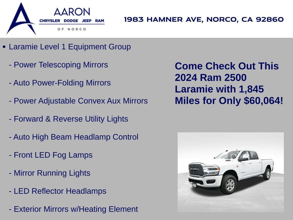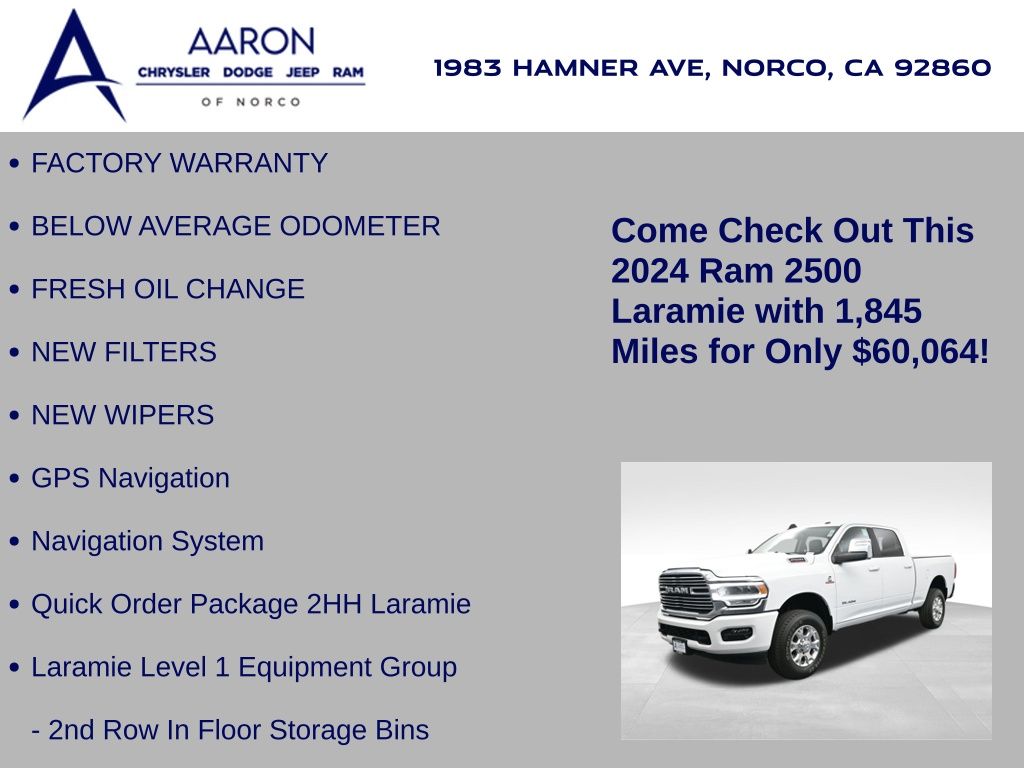 Priced below KBB Fair Purchase Price!FACTORY WARRANTY, BELOW AVERAGE ODOMETER, FRESH OIL CHANGE, NEW FILTERS, NEW WIPERS, 2500 Laramie, 4D Crew Cab, Cummins 6.7L I6 Turbodiesel, 6-Speed Automatic, 4WD, 115V Auxiliary Rear Power Outlet, 12" Touchscreen Display, 2nd Row In Floor Storage Bins, 4G LTE Wi-Fi Hot Spot, Alexa Built-In, Alloy wheels, Apple CarPlay/Android Auto, Auto Adjust In Reverse Exterior Mirrors, Auto Dim Exterior Mirror, Auto High Beam Headlamp Control, Auto Power-Folding Mirrors, Auto-Dimming Exterior Passenger Mirror, Blind Spot & Cross Path Detection, Center Hub, Chrome Exterior Mirrors, Compass, Connected Travel & Traffic Services, Connectivity - US/Canada, Disassociated Touchscreen Display, Dual front side impact airbags, Exterior Mirrors Courtesy Lamps, Exterior Mirrors w/Heating Element, Exterior Mirrors w/Memory, Exterior Mirrors w/Supplemental Signals, Foam Bottle Insert (Door Trim Panel), For Details, Visit DriveUconnect.com, For More Info, Call 800-643-2112, Forward & Reverse Utility Lights, Front dual zone A/C, Front LED Fog Lamps, Global Telematics Box Module (TBM), Google Android Auto, GPS Antenna Input, GPS Navigation, HD Radio, Heated Front Seats, Integrated Voice Command w/Bluetooth, Laramie Level 1 Equipment Group, LED Reflector Headlamps, LED Tail Lamps, Mirror Running Lights, Navigation System, Off-Road Information Pages, Overhead airbag, ParkSense Front/Rear Park Assist System, ParkView Rear Back-Up Camera, Power Adjust Mirrors, Power Adjustable Convex Aux Mirrors, Power Adjustable Pedals w/Memory, Power Heated Fold Telescopic Mirrors w/Memory, Power Telescoping Mirrors, Quick Order Package 2HH Laramie, Radio: Uconnect 5 Nav w/12.0" Display, Rain Sensitive Windshield Wipers, Rear Power Sliding Window, Rear Window Defroster, Remote Tailgate Release, Selectable Tire Fill Alert, SiriusXM Radio Service, SiriusXM w/360L, Tow Hooks, Trailer Tow Pages, Wheels: 18" x 8.0" Polished Aluminum.Clean CARFAX.CARFAX One-Owner.