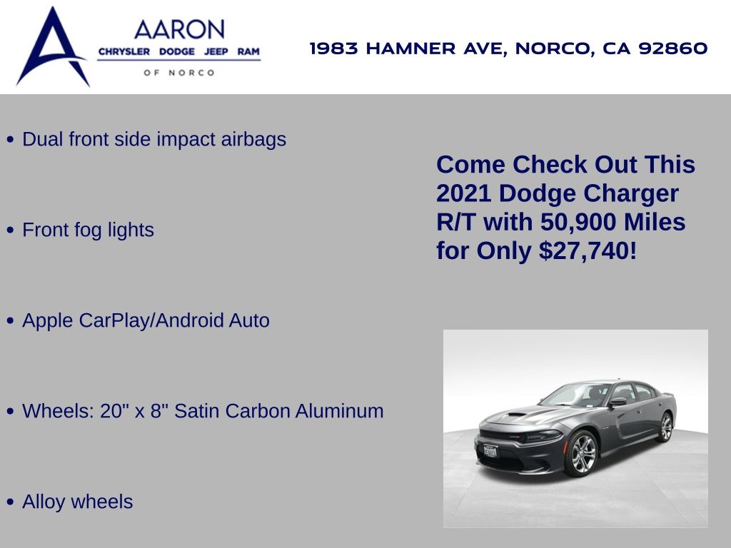 Priced below KBB Fair Purchase Price!FACTORY WARRANTY, FRESH OIL CHANGE, NEW FILTERS, NEW WIPERS, Charger R/T, 4D Sedan, HEMI 5.7L V8 Multi Displacement VVT, 8-Speed Automatic, RWD, Alloy wheels, Apple CarPlay/Android Auto, Dual front side impact airbags, Front dual zone A/C, Front fog lights, Knee airbag, Overhead airbag, Power driver seat, Quick Order Package 29N, Radio: Uconnect 4C w/8.4" Display, Wheels: 20" x 8" Satin Carbon Aluminum.Clean CARFAX.
