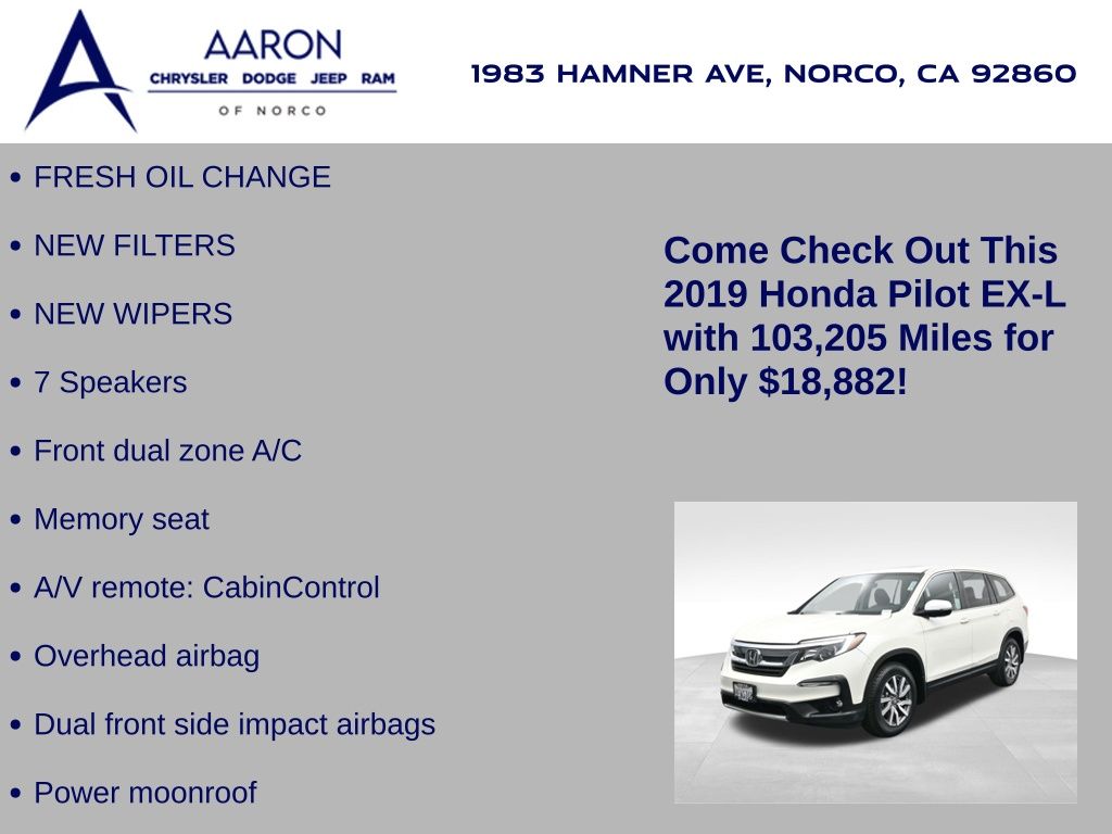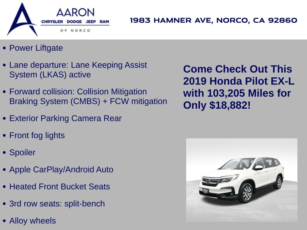 FRESH OIL CHANGE, NEW FILTERS, NEW WIPERS, Pilot EX-L, 4D Sport Utility, 3.5L V6 24V SOHC i-VTEC, 6-Speed Automatic, Black Leather, 3rd row seats: split-bench, 7 Speakers, A/V remote: CabinControl, Alloy wheels, Apple CarPlay/Android Auto, Dual front side impact airbags, Exterior Parking Camera Rear, Forward collision: Collision Mitigation Braking System (CMBS) + FCW mitigation, Front dual zone A/C, Front fog lights, Heated Front Bucket Seats, Lane departure: Lane Keeping Assist System (LKAS) active, Memory seat, Overhead airbag, Power Liftgate, Power moonroof, Spoiler.Awards: * ALG Residual Value Awards, Residual Value Awards