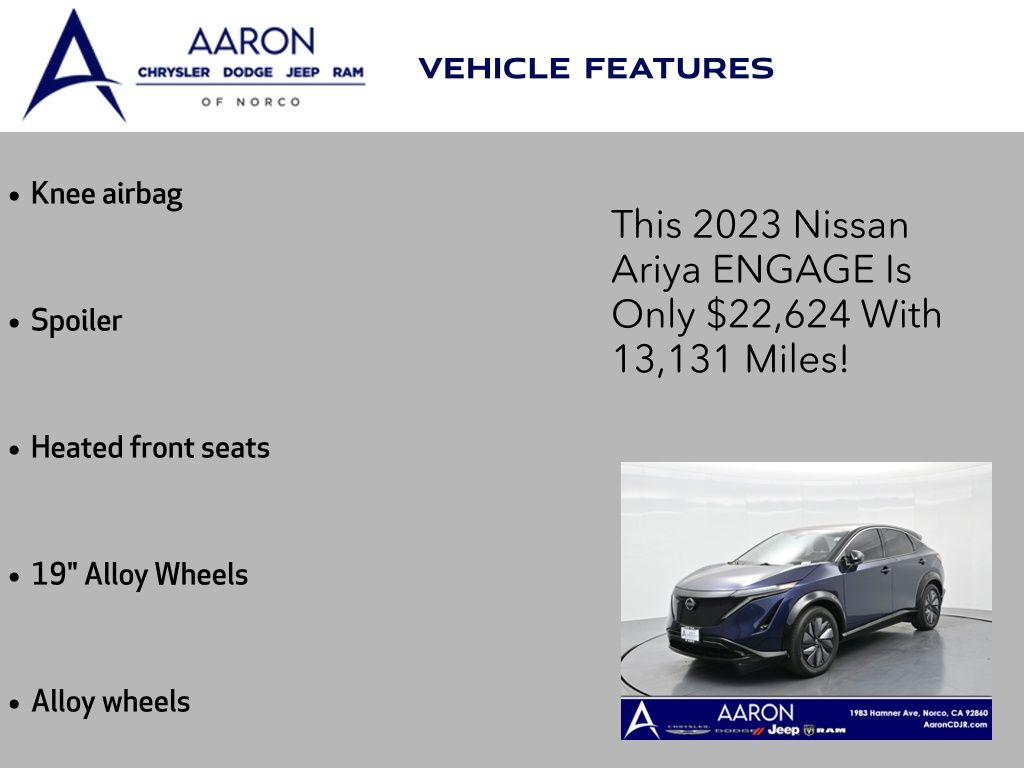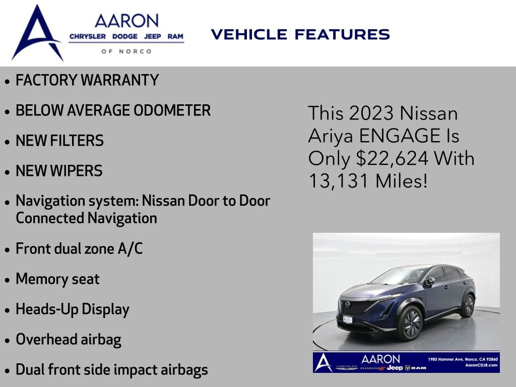 Priced below KBB Fair Purchase Price!FACTORY WARRANTY, BELOW AVERAGE ODOMETER, NEW FILTERS, NEW WIPERS, Ariya ENGAGE, 4D Sport Utility, Electric Motor, FWD, 19" Alloy Wheels, Alloy wheels, Dual front side impact airbags, Front dual zone A/C, Heads-Up Display, Heated front seats, Knee airbag, Memory seat, Navigation system: Nissan Door to Door Connected Navigation, Overhead airbag, Spoiler.Clean CARFAX.CARFAX One-Owner.