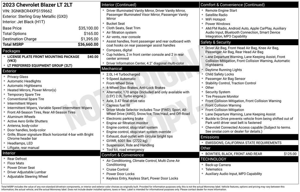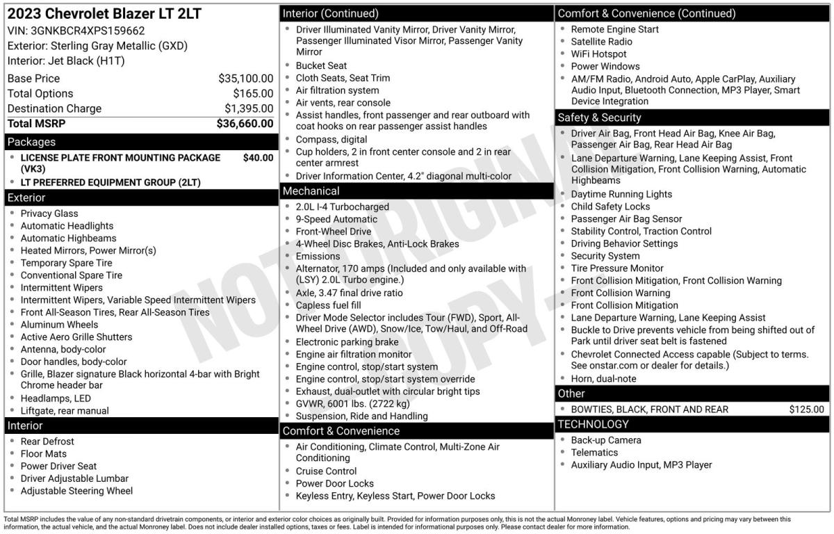 Discover the perfect blend of style, performance, and utility in the 2023 Chevrolet Blazer LT. This exceptional SUV offers an unparalleled driving experience, packed with cutting-edge features that cater to your every need.Boasting a sleek and modern exterior, the Blazer LT commands attention with its striking Gray finish and bold, black accents. Under the hood, the 2.0L Turbocharged engine delivers a thrilling 9-speed automatic transmission, providing the perfect balance of power and efficiency with an impressive 22 city and 29 highway MPG.Elevating your driving experience, this Blazer LT is equipped with a remarkable array of premium features:• Black front and rear Bowties• License Plate Front Mounting Package• Preferred Equipment Group 2LT• 6-Speaker Audio System• Chevrolet Infotainment 3 Plus with SiriusXM w/360L• Dual-Zone Automatic Climate Control• 8-Way Power Driver's Seat with Lumbar Support• 4-Way Manual Front Passenger SeatStep inside the Blazer LT and discover a cabin that seamlessly blends style and comfort. The premium cloth seats and leather-wrapped steering wheel provide a luxurious touch, while the advanced technology features, including Apple CarPlay and Android Auto, keep you connected and entertained on every journey.Safety is of the utmost importance, and the Blazer LT delivers with a comprehensive suite of driver-assistance technologies. From the Collision Warning System and Parking Sensors to the Electronic Stability Control and Antilock Brakes, you can drive with confidence knowing your safety is prioritized.With its exceptional performance, striking design, and impressive list of features, the 2023 Chevrolet Blazer LT is the perfect choice for those seeking a versatile and sophisticated SUV. Experience the difference for yourself and schedule a test drive today. We're confident you'll be impressed by the Blazer LT's unparalleled capabilities and value.