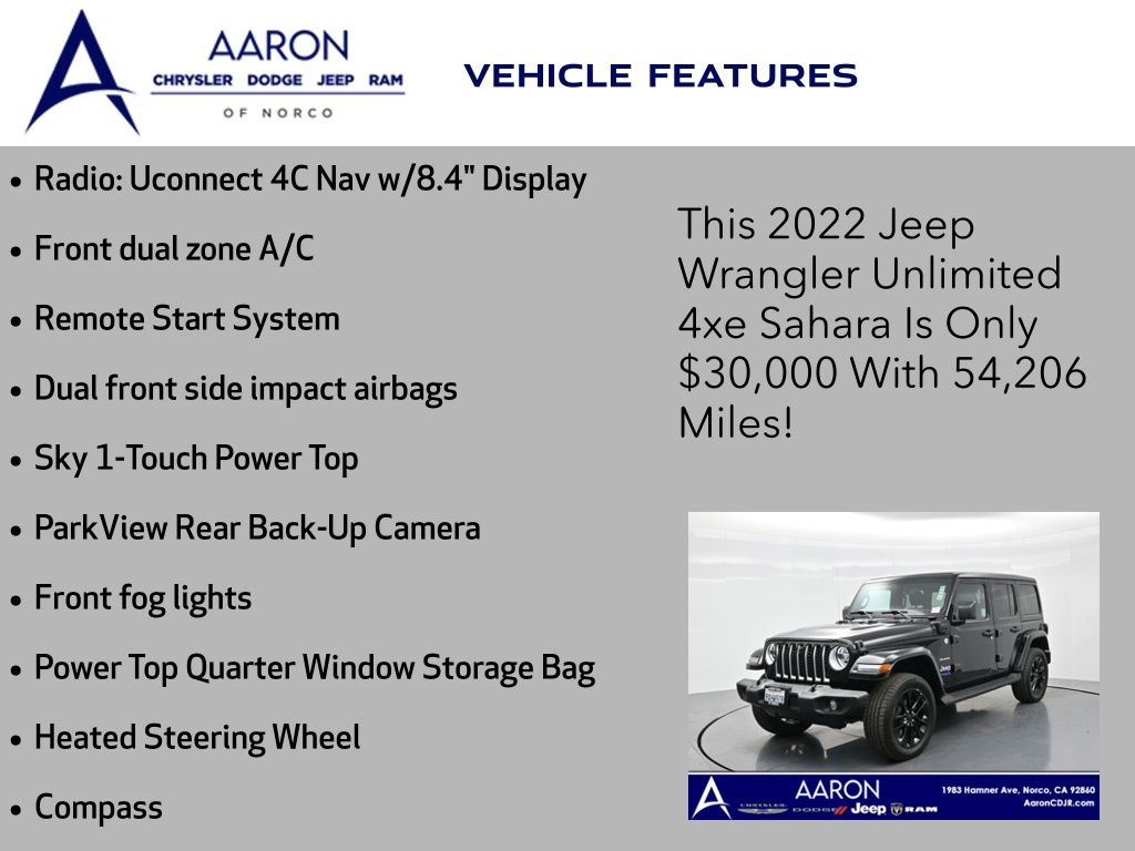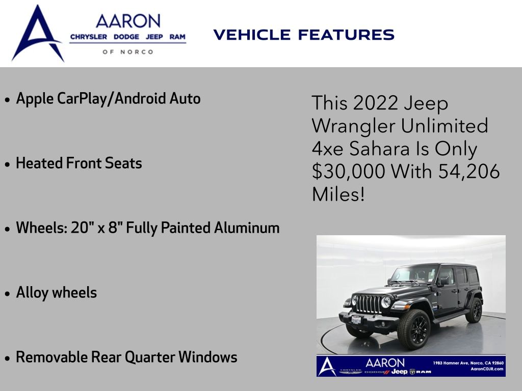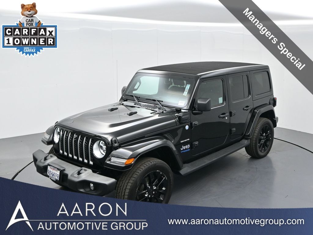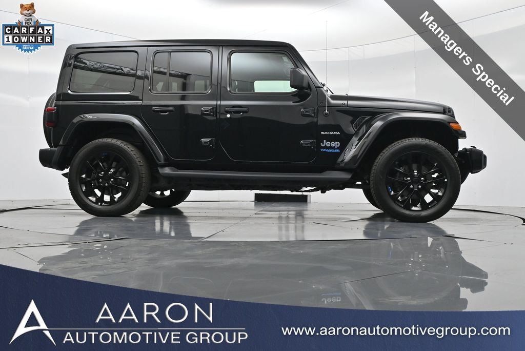 Priced below KBB Fair Purchase Price!FACTORY WARRANTY, FRESH OIL CHANGE, NEW FILTERS, NEW WIPERS, Wrangler Unlimited Sahara 4xe, 4D Sport Utility, 8-Speed Automatic, 4WD, Alloy wheels, Apple CarPlay/Android Auto, Cold Weather Group, Compass, Dual front side impact airbags, Front dual zone A/C, Front fog lights, Heated Front Seats, Heated Steering Wheel, Navigation System, ParkView Rear Back-Up Camera, Power Top Quarter Window Storage Bag, Quick Order Package 29P, Radio: Uconnect 4C Nav w/8.4" Display, Remote Start System, Removable Rear Quarter Windows, Sky 1-Touch Power Top, Wheels: 20" x 8" Fully Painted Aluminum.CARFAX One-Owner.