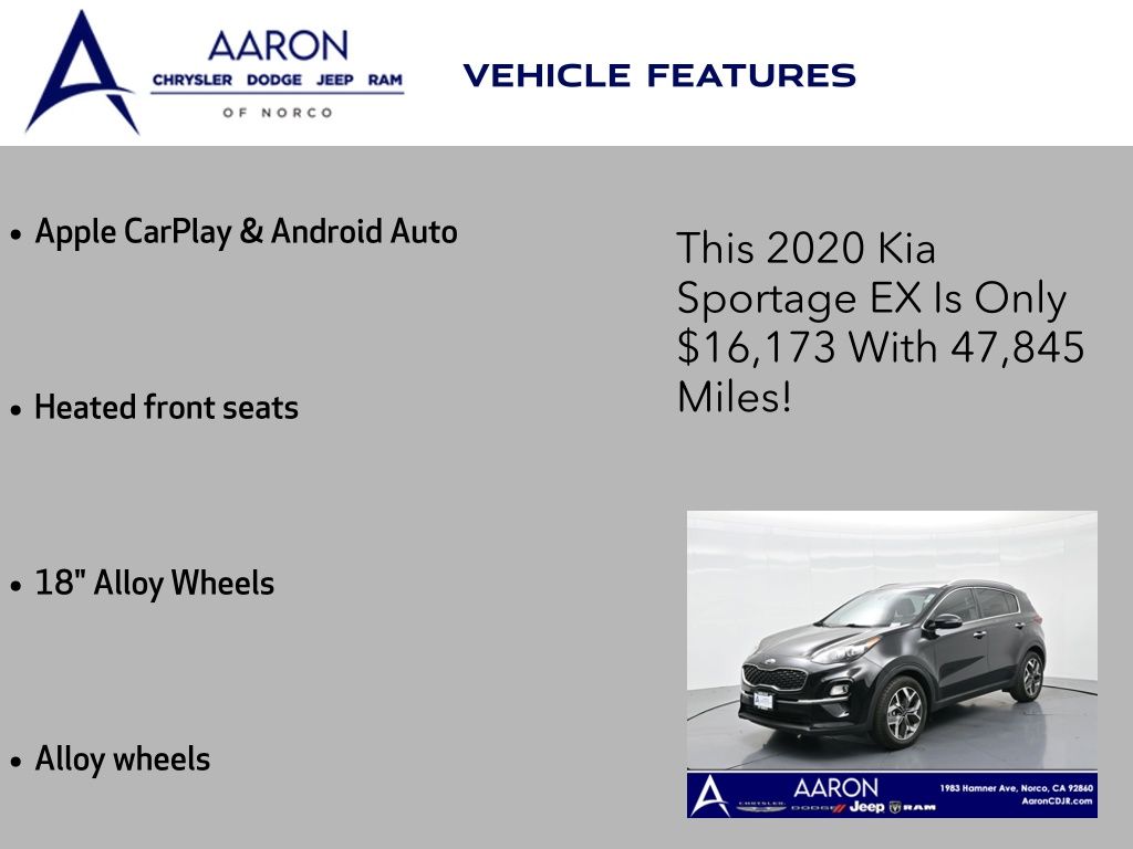 Priced below KBB Fair Purchase Price!FRESH OIL CHANGE, NEW FILTERS, NEW WIPERS, Sportage EX, 4D Sport Utility, 2.4L I4 DGI DOHC 16V, 6-Speed Automatic Electronic with Overdrive, FWD, 18" Alloy Wheels, Alloy wheels, Apple CarPlay & Android Auto, Dual front side impact airbags, Exterior Parking Camera Rear, Front dual zone A/C, Front fog lights, Heated front seats, Overhead airbag, Power Liftgate, Spoiler.Clean CARFAX.