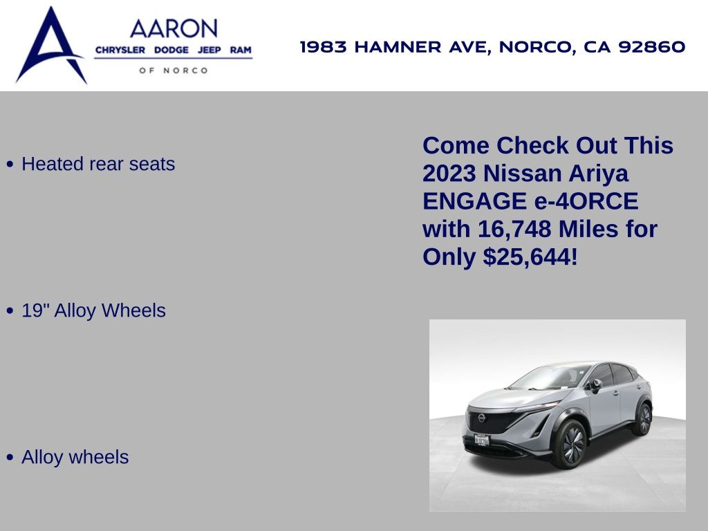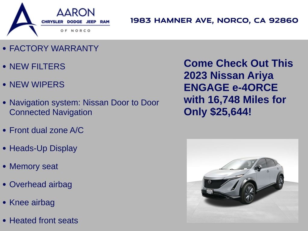 FACTORY WARRANTY, NEW FILTERS, NEW WIPERS, Ariya ENGAGE e-4ORCE, 4D Sport Utility, Electric Motor, AWD, Charcoal Artificial Leather, 19" Alloy Wheels, Alloy wheels, Front dual zone A/C, Heads-Up Display, Heated front seats, Heated rear seats, Knee airbag, Memory seat, Navigation system: Nissan Door to Door Connected Navigation, Overhead airbag.Clean CARFAX.CARFAX One-Owner.