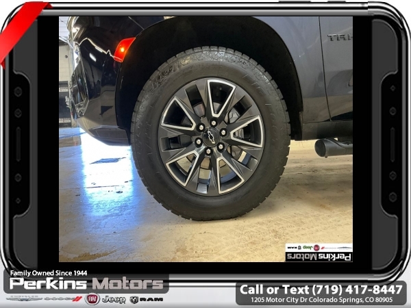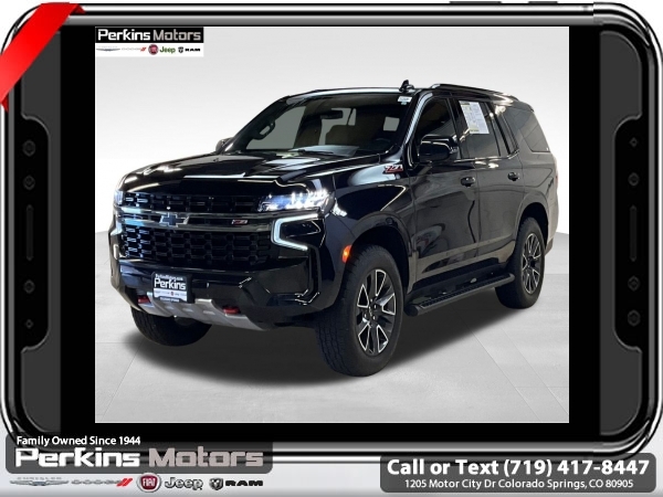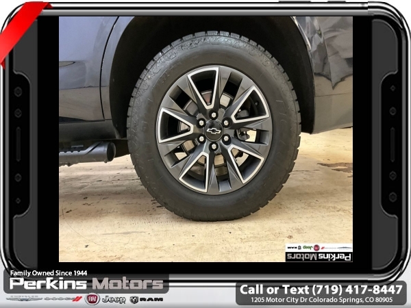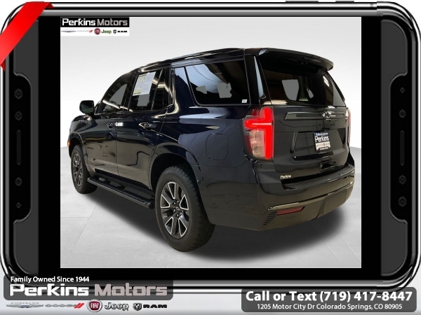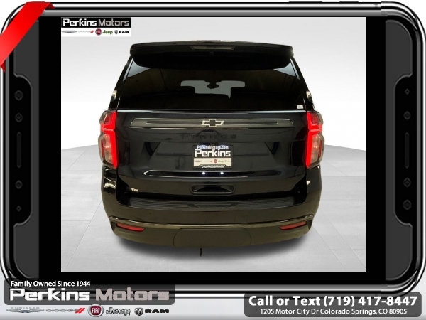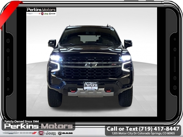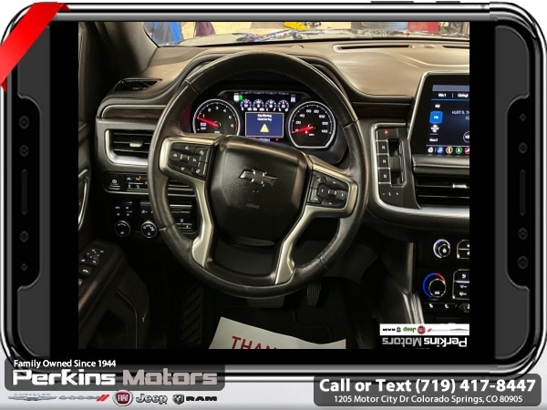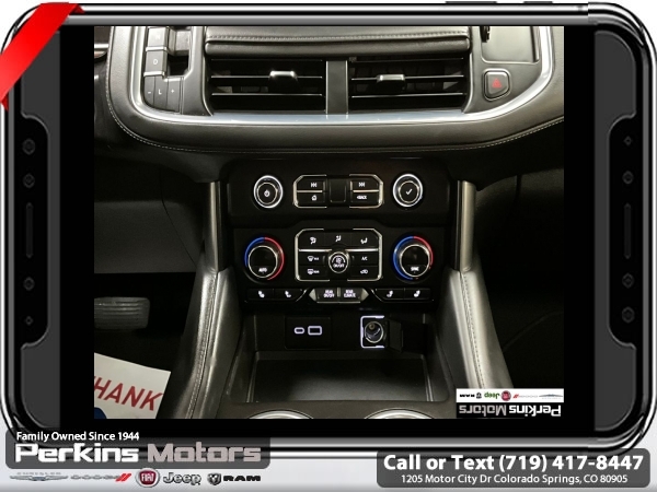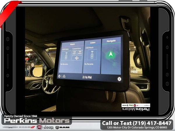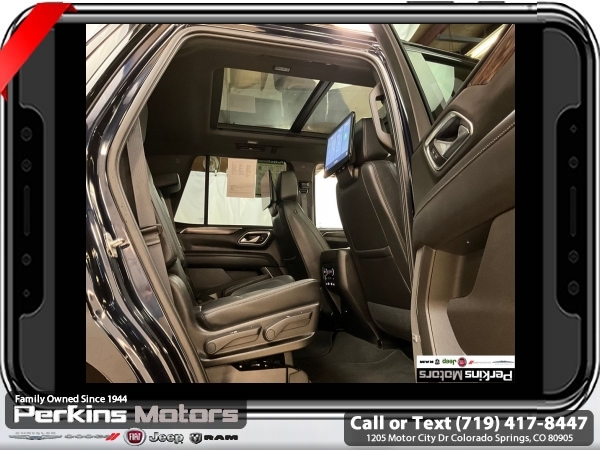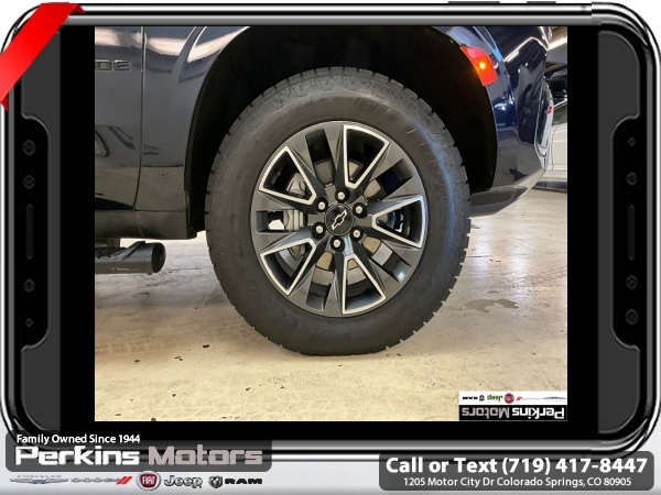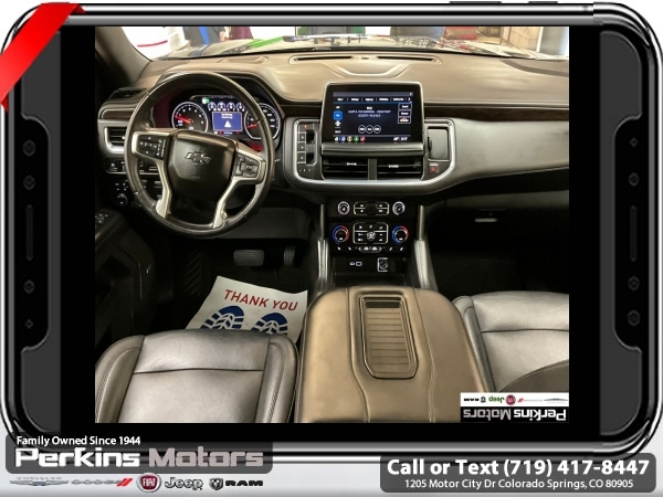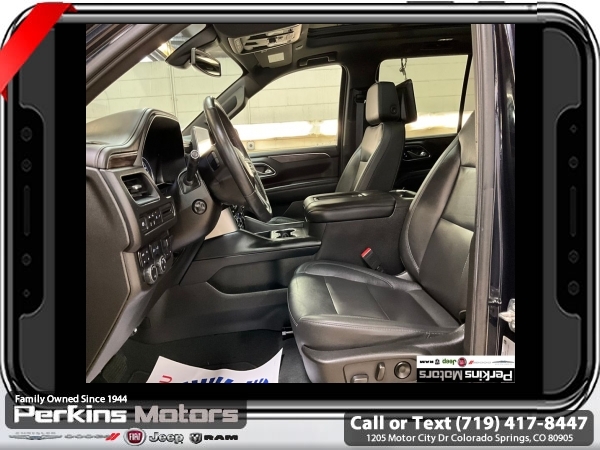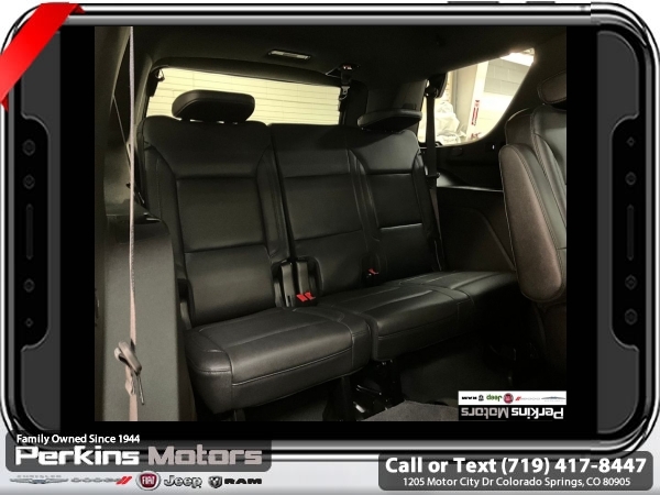 Midnight Blue Metallic 4WD EcoTec3 5.3L V8 10-Speed Automatic with Overdrive<br><br>4WD, Black Leather.<br><br><br>Clean CARFAX.<br><br>Check us out at www.perkinsmotors.com to see our specials! Since opening our doors in 1944, we’ve been proud to serve Colorado Springs, CO, and the surrounding areas of Pueblo, Castle Rock and Denver, CO. Throughout this time of being family owned for 80 years, we’ve maintained a firm commitment to our customers: to offer a wide selection of New Chrysler, Dodge, Fiat, Jeep, and Ram vehicles and quality pre-owned vehicles, and provide a quick, no-hassle car-buying process that ensures everyone drives off the lot satisfied with their purchase.<br><br><br>Awards:<br> * JD Power Automotive Performance, Execution and Layout (APEAL) Study * ALG Residual Value<br><br>Advanced Trailering Package (Advanced Trailering System, Hitch Guidance w/Hitch View, and Integrated Trailer Brake Controller), Driver Alert Package (Front & Rear Park Assist, Lane Change Alert w/Side Blind Zone Alert, Lane Keep Assist w/Lane Departure Warning, and Rear Cross Traffic Alert), License Plate Front Mounting Package, Luxury Package (2nd Row Pwr Release 60/40 Split-Folding Bench Seat, 3rd Row 60/40 Power-Folding Split-Bench Seat, Automatic Heated Steering Wheel, HD Surround Vision, Heated 2nd Row Outboard Seats, Memory Settings, Outside Heated Power-Adjustable Mirrors, Power Tilt & Telescopic Steering Column, and Rear Pedestrian Alert), Max Trailering Package (Extra Capacity Cooling System), Off-Road Capability Package (Air Ride Adaptive Suspension, Enhanced Driver Information Center, and Magnetic Ride Control Suspension), Preferred Equipment Group 2Z7 (1st & 2nd Row Color-Keyed Carpeted Floor Mats, 2 USB Data Ports, 2-Speed Active Electronic AutoTrac Transfer Case, Auto-Dimming Inside Rear-View Mirror, Black Tubular Assist Steps, Bright Front & Rear Door Sill Plates, Color-Keyed Carpeting Floor Covering, Driver & Front Outboard Passenger Airbags, Floor Console w/Storage Area, Front High-Approach Angle Fascia, Hands-Free Rear Power Programmable Liftgate, HD Radio, Hill Descent Control, Infotainment Display, Leather-Wrapped Steering Wheel, LED Daytime Running Lamps, Memory Settings for Driver, Red Horizontal-Mounted Recovery Hooks, Remote Start, SiriusXM Radio w/360L, and Universal Home Remote), Rear Media & Nav Package (Radio: Chevrolet Infotainment 3 Premium System, Rear Seat Media System, and SiriusXM NavTraffic), Z71 Off-Road Package, 4WD, Black Leather, 10-Way Power Driver & Passenger Seat Adjusters, 3.23 Rear Axle Ratio, 3rd row seats: split-bench, 4-Wheel Disc Brakes, 9 Speakers, ABS brakes, Air Conditioning, Alloy wheels, AM/FM radio: SiriusXM with 360L, Apple CarPlay/Android Auto, Auto High-beam Headlights, Auto-dimming Rear-View mirror, Automatic temperature control, Bose 9-Speaker Stereo Audio System Feature, Brake assist, Bumpers: body-color, Compass, Cruise Control, Delay-off headlights, Driver door bin, Driver vanity mirror, Dual front impact airbags, Dual front side impact airbags, Dual-Pane Power Panoramic Sunroof, Electronic Stability Control, Emergency communication system: OnStar and Chevrolet connected services capable, Four wheel independent suspension, Front anti-roll bar, Front Bucket Seats, Front Center Armrest, Front dual zone A/C, Front High-Back Reclining Bucket Seats, Front reading lights, Fully automatic headlights, Garage door transmitter, Heated door mirrors, Heated Driver & Front Passenger Seats, Heated front seats, Illuminated entry, Leather Seat Trim, Leather steering wheel, Low tire pressure warning, Memory seat, Occupant sensing airbag, Outside temperature display, Overhead airbag, Overhead console, Panic alarm, Passenger door bin, Passenger vanity mirror, Power door mirrors, Power driver seat, Power Liftgate, Power passenger seat, Power Release 2nd Row Bucket Seats, Power steering, Power windows, Premium audio system: Chevrolet Infotainment 3, Premium Smooth Ride Suspension, Radio: Ch