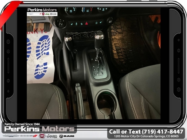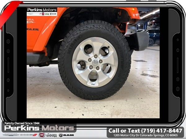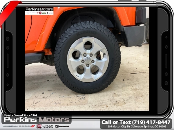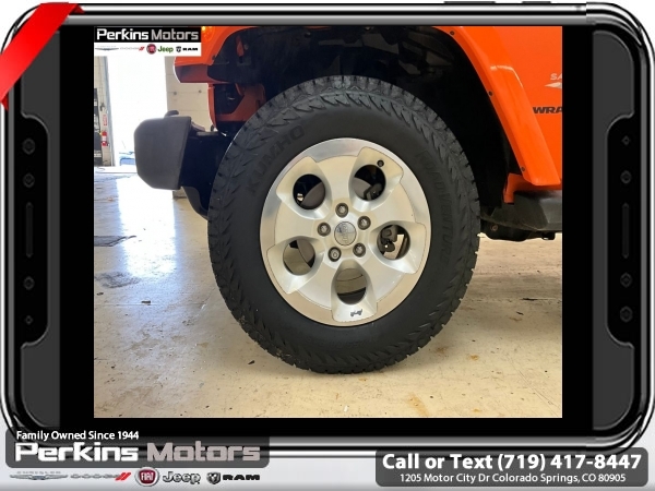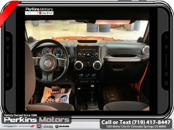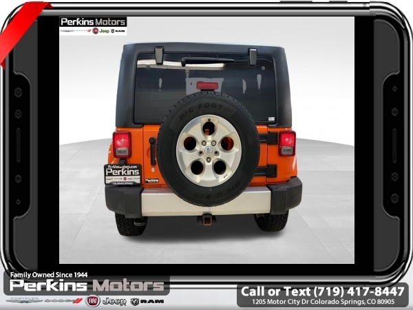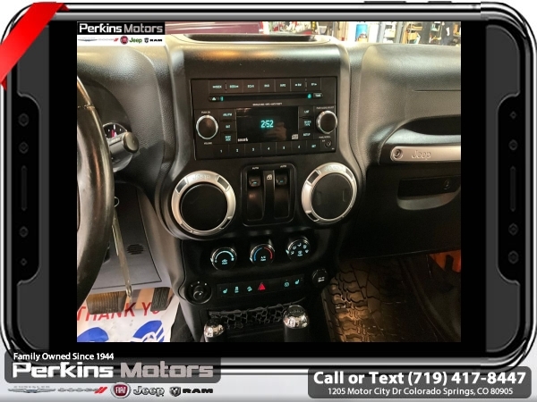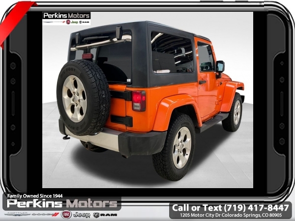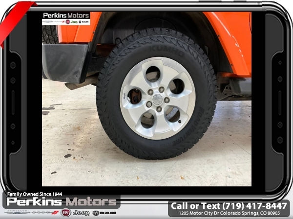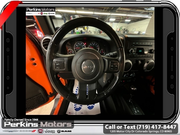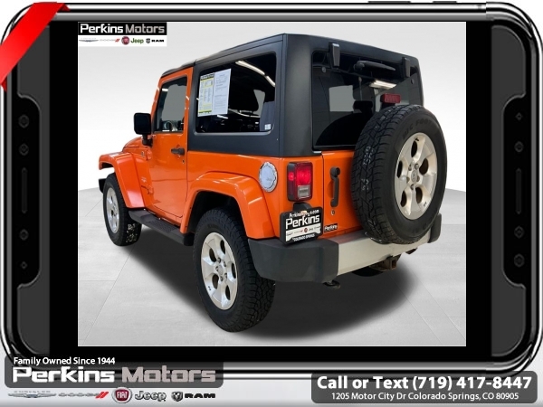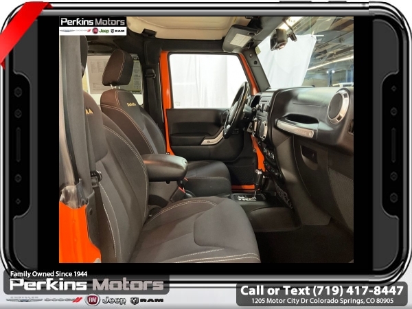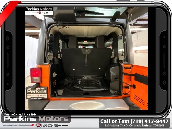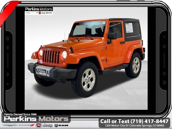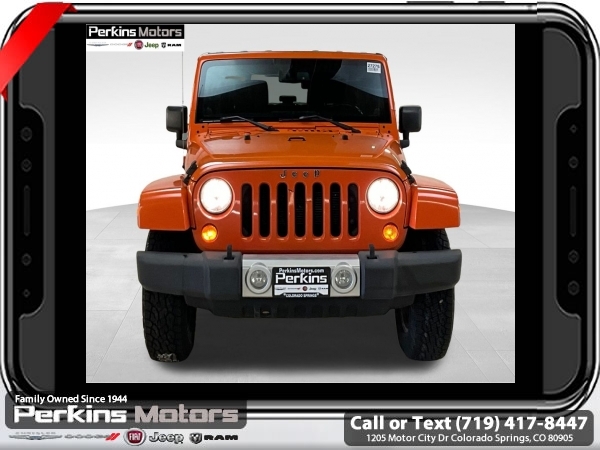 Crush Clearcoat 4WD 3.6L V6 24V VVT 5-Speed Automatic<br><br><br>Clean CARFAX.<br><br>Check us out at www.perkinsmotors.com to see our specials! Since opening our doors in 1944, we’ve been proud to serve Colorado Springs, CO, and the surrounding areas of Pueblo, Castle Rock and Denver, CO. Throughout this time of being family owned for 80 years, we’ve maintained a firm commitment to our customers: to offer a wide selection of New Chrysler, Dodge, Fiat, Jeep, and Ram vehicles and quality pre-owned vehicles, and provide a quick, no-hassle car-buying process that ensures everyone drives off the lot satisfied with their purchase.<br><br><br>Awards:<br> * 2013 KBB.com Best Resale Value Awards<br><br>Dual Top Group, Quick Order Package 24G, 3.21 Rear Axle Ratio, 3.73 Rear Axle Ratio, 4-Wheel Disc Brakes, 7 Speakers, ABS brakes, AFTERMARKET RIMS, Air Conditioning, Alloy wheels, AM/FM radio: SIRIUS, Anti-Spin Differential Rear Axle, Audio Jack Input for Mobile Devices, Auto-dimming Rear-View mirror, Brake assist, CD player, Cloth Bucket Seats, Compass, Cruise Control, Driver door bin, Driver vanity mirror, Dual front impact airbags, Electronic Stability Control, Front anti-roll bar, Front Bucket Seats, Front Center Armrest w/Storage, Front fog lights, Front reading lights, Fully automatic headlights, Heated door mirrors, Heated Front Seats, Heavy Duty Suspension w/Gas Shocks, Illuminated entry, Integrated roll-over protection, Leather steering wheel, Low tire pressure warning, Occupant sensing airbag, Outside temperature display, Panic alarm, Passenger door bin, Passenger vanity mirror, Power door mirrors, Power steering, Power windows, Radio data system, Radio: Uconnect 130 AM/FM/CD/MP3, Rear anti-roll bar, Remote keyless entry, Security system, Steering wheel mounted audio controls, Sunrider Soft Top, Tachometer, Tilt steering wheel, Traction control, Trip computer, and Variably intermittent wipers.