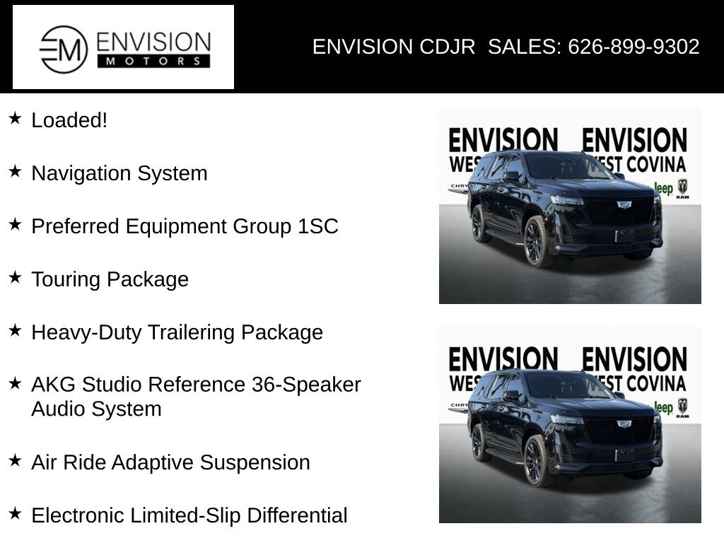 WE SPECIALIZE IN ALL CREDIT PROFILES! See what we can do for you! Call to find out (626) 899-9302.CARFAX One-Owner.Loaded!, 4WD, Jet Black w/Leather Seating Surfaces w/Precision Perf Inserts, 2-Speed Active Transfer Case, Adaptive Cruise Control, Air Ride Adaptive Suspension, AKG Studio Reference 36-Speaker Audio System, Automatic Seat Belt Tightening, Automatic Stop/Start, Body-Color Door Handles, Cat-Back Performance Exhaust (LPO), Door Lock & Latch Shields, Electronic Limited-Slip Differential, Enhanced Automatic Emergency Braking, Enhanced Automatic Parking Assist, Extra Capacity Cooling System, Glass Breakage Sensor, Heavy-Duty Trailering Package, Hitch Guidance w/Hitch View, Illuminating Front & Rear Sill Plates, Integrated Trailer Brake Controller, Navigation System, Power Panoramic Tilt-Sliding Sunroof, Preferred Equipment Group 1SC, Rear Camera Mirror, Rear Camera Mirror Washer, Rear Cross Traffic Alert, Reconfigurable Full-Color Head-Up Display, Reverse Automatic Braking, Running Board Assist Steps, Smart Trailer Integration Indicator, Soft Closing Front & Rear Doors, Start/Stop System Disable Button, Super Cruise, Theft-Deterrent Alarm System, Touring Package, Trailer Side Blind Zone Alert, Trailer Tire Pressure Monitoring System, Trailering Assist Guidelines, Vehicle Inclination Sensor, Vehicle Interior Movement Sensor, Wheels: 22" 12-Spoke Gloss Black Alloy (LPO), Wheels: 22" Interim (LPO), Wired Auxiliary Trailer Camera (LPO).Black Raven2022 Cadillac Escalade Sport 4WD 10-Speed Automatic 6.2L V8**********All Pricing and Advertised Prices for any/all vehicles offered for sale does not include dealer installed accessories which can be purchased for an additional cost.********** The Factory Rebates may not be available on this vehicle if you elect to take advantage of a Special Alternative APR or Special Lease program. Some Factory Rebates are California Resident specific and may vary for residents of other states. NO sales to Dealers, Brokers or Exporters. For out of state purchase, customers must be present to purchase. If shipping is required, dealership must facilitate; no exceptions. Please contact us for special Multi-Vehicle or Fleet pricing. Prices are plus government fees and taxes, any finance charges, $85 documentary fee, $29 electronic registration fee, any emission testing charge and $1.75 per new tire state tire fee. *** We make every effort to provide accurate information, but please verify before purchasing. Leasing & financing available on approved credit. Trade-ins accepted. Subject to prior sale.