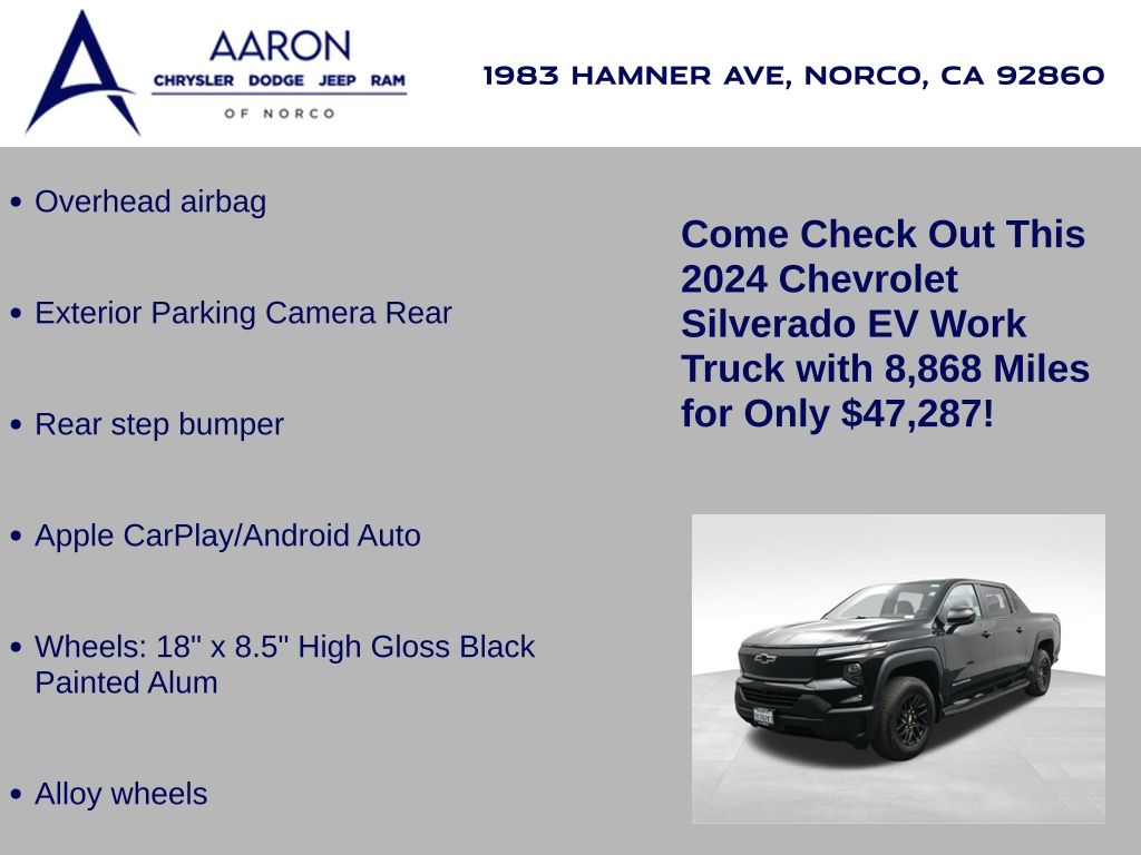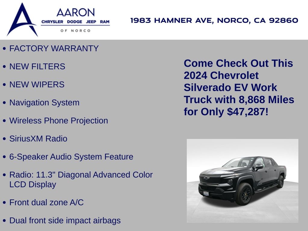 Priced below KBB Fair Purchase Price!FACTORY WARRANTY, NEW FILTERS, NEW WIPERS, Silverado EV Work Truck, 4D Crew Cab, Electric ZEV, 1-Speed Automatic, AWD, 6-Speaker Audio System Feature, Alloy wheels, Apple CarPlay/Android Auto, Dual front side impact airbags, Exterior Parking Camera Rear, Front dual zone A/C, Navigation System, Overhead airbag, Radio: 11.3" Diagonal Advanced Color LCD Display, Rear step bumper, SiriusXM Radio, Wheels: 18" x 8.5" High Gloss Black Painted Alum, Wireless Phone Projection.Clean CARFAX.CARFAX One-Owner.
