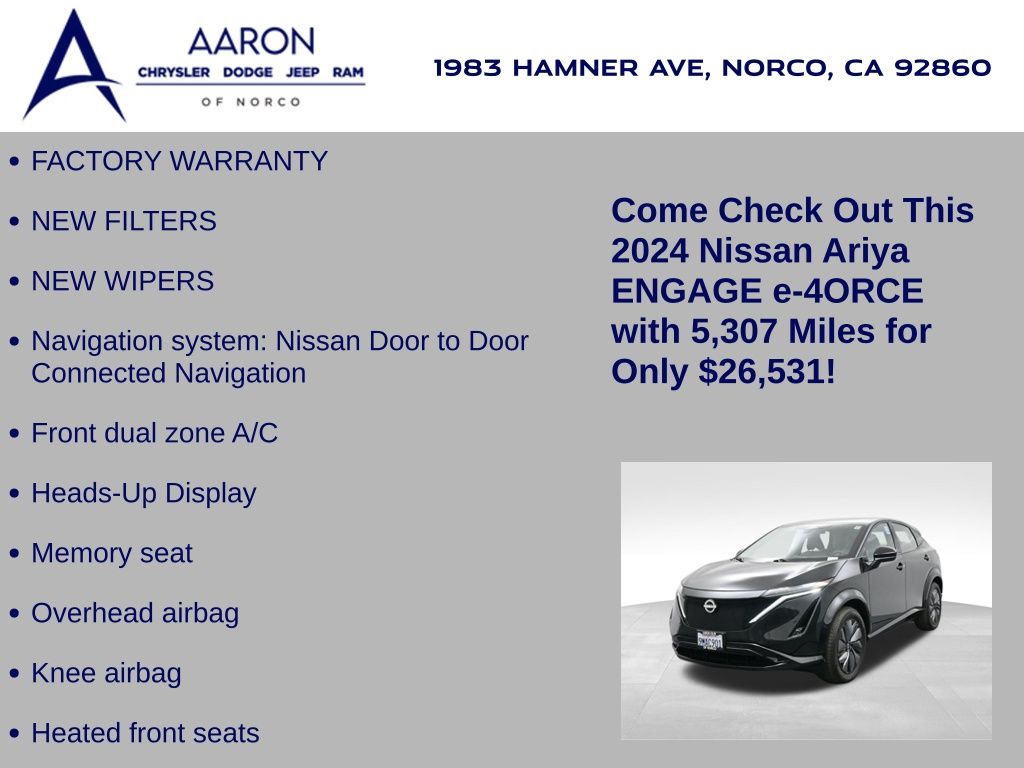 FACTORY WARRANTY, NEW FILTERS, NEW WIPERS, Ariya ENGAGE e-4ORCE, 4D Sport Utility, Electric Motor, CVT, AWD, 19" Alloy Wheels, Front dual zone A/C, Heads-Up Display, Heated front seats, Heated rear seats, Knee airbag, Memory seat, Navigation system: Nissan Door to Door Connected Navigation, Overhead airbag.Clean CARFAX.CARFAX One-Owner.