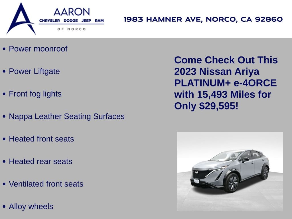 FACTORY WARRANTY, BELOW AVERAGE ODOMETER, NEW FILTERS, NEW WIPERS, Ariya PLATINUM+ e-4ORCE, 4D Sport Utility, Electric Motor, AWD, Alloy wheels, Front dual zone A/C, Front fog lights, Heads-Up Display, Heated front seats, Heated rear seats, Knee airbag, Memory seat, Nappa Leather Seating Surfaces, Navigation system: Nissan Door to Door Connected Navigation, Overhead airbag, Power Liftgate, Power moonroof, Ventilated front seats.Clean CARFAX.