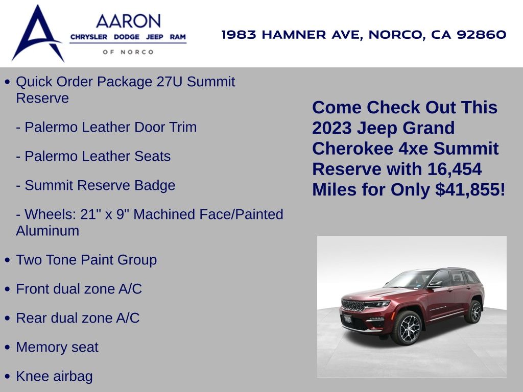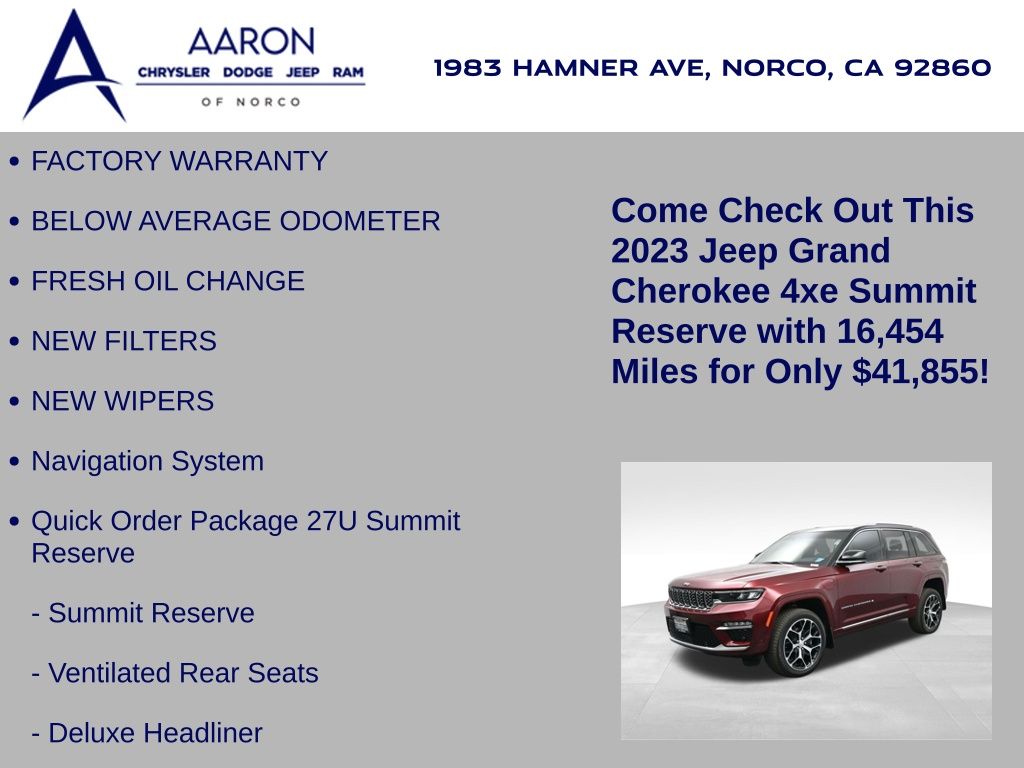 Priced below KBB Fair Purchase Price!FACTORY WARRANTY, BELOW AVERAGE ODOMETER, FRESH OIL CHANGE, NEW FILTERS, NEW WIPERS, Grand Cherokee Summit Reserve 4xe, 4D Sport Utility, 2.0L I4 DOHC, 8-Speed Automatic, 4WD, Alloy wheels, Deluxe Headliner, Front dual zone A/C, Front fog lights, Heated front seats, Heated rear seats, Knee airbag, Memory seat, Nappa Leather Seats, Navigation System, Overhead airbag, Palermo Leather Door Trim, Palermo Leather Seats, Power Liftgate, Power moonroof, Quick Order Package 27U Summit Reserve, Rear dual zone A/C, Spoiler, Summit Reserve, Summit Reserve Badge, Two Tone Paint Group, Ventilated front seats, Ventilated Rear Seats, Wheels: 20" x 8.5" Fully Painted Aluminum Silver, Wheels: 21" x 9" Machined Face/Painted Aluminum.Clean CARFAX.CARFAX One-Owner.
