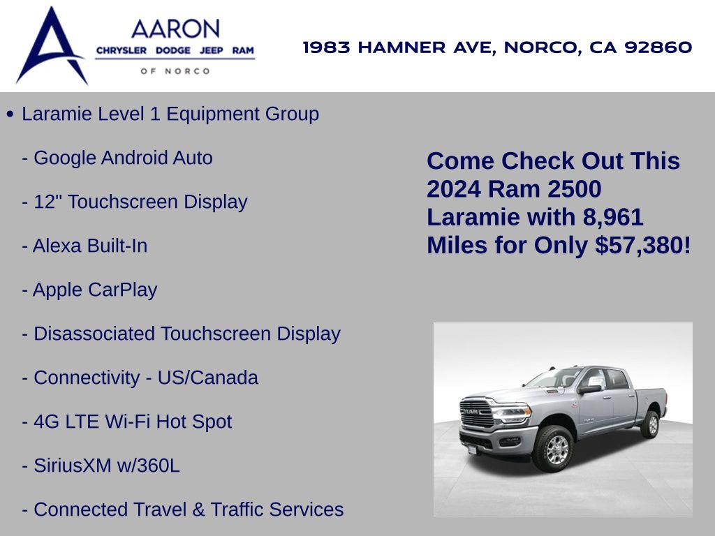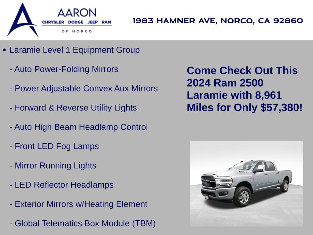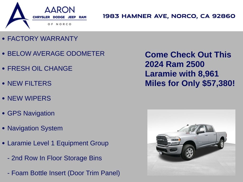 Priced below KBB Fair Purchase Price!FACTORY WARRANTY, BELOW AVERAGE ODOMETER, FRESH OIL CHANGE, NEW FILTERS, NEW WIPERS, 2500 Laramie, 4D Crew Cab, Cummins 6.7L I6 Turbodiesel, 6-Speed Automatic, 4WD, 12" Touchscreen Display, 2nd Row In Floor Storage Bins, 4G LTE Wi-Fi Hot Spot, Alexa Built-In, Alloy wheels, Apple CarPlay/Android Auto, Auto Adjust In Reverse Exterior Mirrors, Auto Dim Exterior Mirror, Auto High Beam Headlamp Control, Auto Power-Folding Mirrors, Auto-Dimming Exterior Passenger Mirror, Blind Spot & Cross Path Detection, Center Hub, Chrome Exterior Mirrors, Connected Travel & Traffic Services, Connectivity - US/Canada, Disassociated Touchscreen Display, Exterior Mirrors Courtesy Lamps, Exterior Mirrors w/Heating Element, Exterior Mirrors w/Memory, Exterior Mirrors w/Supplemental Signals, Foam Bottle Insert (Door Trim Panel), For Details, Visit DriveUconnect.com, For More Info, Call 800-643-2112, Forward & Reverse Utility Lights, Front dual zone A/C, Front LED Fog Lamps, Global Telematics Box Module (TBM), Google Android Auto, GPS Antenna Input, GPS Navigation, HD Radio, Heated Front Seats, Integrated Voice Command w/Bluetooth, Laramie Level 1 Equipment Group, LED Reflector Headlamps, LED Tail Lamps, Mirror Running Lights, Navigation System, Off-Road Information Pages, Overhead airbag, ParkSense Front/Rear Park Assist System, ParkView Rear Back-Up Camera, Power Adjust Mirrors, Power Adjustable Convex Aux Mirrors, Power Adjustable Pedals w/Memory, Power Heated Fold Telescopic Mirrors w/Memory, Power Telescoping Mirrors, Radio: Uconnect 5 Nav w/12.0" Display, Rain Sensitive Windshield Wipers, Rear Power Sliding Window, Rear Window Defroster, Remote Tailgate Release, Selectable Tire Fill Alert, SiriusXM Radio Service, SiriusXM w/360L, Trailer Tow Pages, Wheels: 18" x 8.0" Polished Aluminum.Clean CARFAX.CARFAX One-Owner.