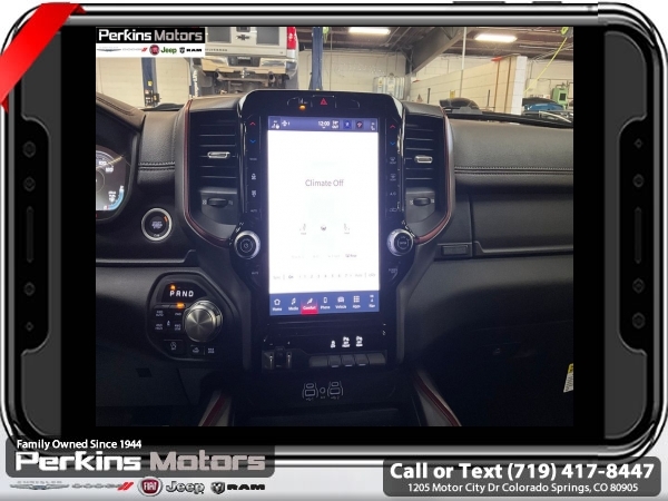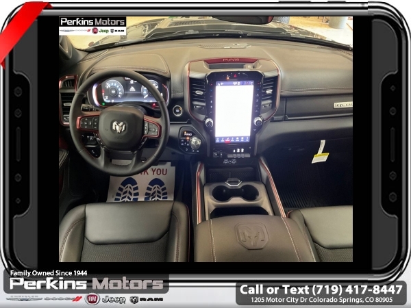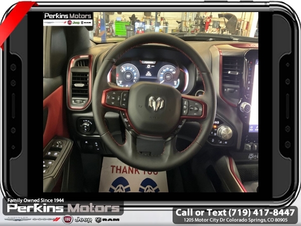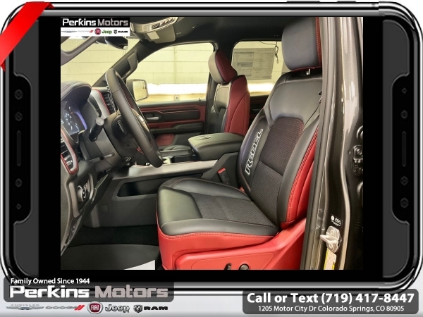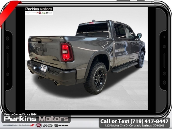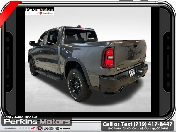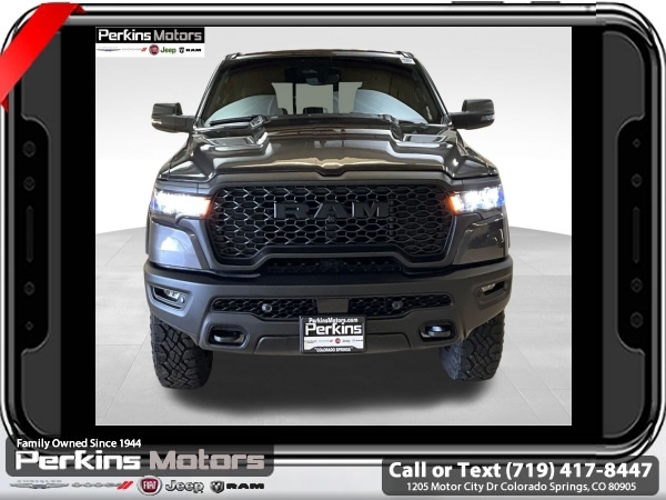 Factory MSRP: $68,665 $10,176 off MSRP! Priced below KBB Fair Purchase Price! Granite Crystal Metallic Clearcoat 2025 Ram 1500 Rebel 4WD 8-Speed Automatic 3.0L I6<br><br>Check us out at www.perkinsmotors.com to see our specials! Since opening our doors in 1944, we’ve been proud to serve Colorado Springs, CO, and the surrounding areas of Pueblo, Castle Rock and Denver, CO. Throughout this time of being family owned for 80 years, we’ve maintained a firm commitment to our customers: to offer a wide selection of New Chrysler, Dodge, Fiat, Jeep, and Ram vehicles and quality pre-owned vehicles, and provide a quick, no-hassle car-buying process that ensures everyone drives off the lot satisfied with their purchase.<br><br>Bed Utility Group (Exterior 115V AC Outlet, MOPAR 4 Adjustable Cargo Tie-Down Hooks, and MOPAR Spray In Bedliner), Quick Order Package 21W Rebel, Rebel Level 1 Equipment Group (Auto Power-Folding Mirrors, Auto-Dimming Exterior Driver Mirror, Black Premium Power Mirrors, Convex Wide-Angle Exterior Mirror Insert, Exterior Mirrors Courtesy Lamps, Exterior Mirrors w/Heating Element, Exterior Mirrors w/Supplemental Signals, Power Adjustable Pedals, Rear Window Defroster, Remote Tailgate Release, and Wireless Charging Pad), 10 Speakers, 3.92 Rear Axle Ratio, 33 Gallon Fuel Tank, 4 Way Front Headrests, 4-Wheel Disc Brakes, 4G LTE Wi-Fi Hot Spot, ABS brakes, Air Conditioning, Alloy wheels, AM/FM radio: SiriusXM with 360L, Apple CarPlay, Apple CarPlay/Android Auto, Auto High-beam Headlights, Auto-dimming Rear-View mirror, Automatic temperature control, Brake assist, Bucket Seats, Cloth/Vinyl Bucket Seats, Compass, Connected Travel & Traffic Services, Connectivity - US/Canada, Cruise Control, Delay-off headlights, Driver door bin, Driver vanity mirror, Dual front impact airbags, Dual front side impact airbags, Electronic Stability Control, Front anti-roll bar, Front Bucket Seats, Front Center Armrest w/Storage, Front dual zone A/C, Front fog lights, Front License Plate Bracket, Front reading lights, Front Seat Back Map Pockets, Front wheel independent suspension, Full Length Upgraded Floor Console, Fully automatic headlights, Garage door transmitter, Google Android Auto, GPS Antenna Input, GPS Navigation, Heated door mirrors, Heated front seats, Heated steering wheel, Illuminated entry, Integrated Voice Command w/Bluetooth, Leather steering wheel, Low tire pressure warning, Manual Folding Exterior Mirrors, Manufacturer's Statement of Origin, Mopar Black Tubular Side Steps, Navigation System, Occupant sensing airbag, Outside temperature display, Overhead airbag, Overhead console, Panic alarm, ParkView Rear Back-Up Camera, Passenger door bin, Passenger vanity mirror, Power Adjust 8-Way Driver Seat, Power door mirrors, Power driver seat, Power steering, Power windows, Radio data system, Radio: Uconnect 5 Nav w/12.0 Display, Rear 60/40 Folding Seat, Rear anti-roll bar, Rear seat center armrest, Rear step bumper, Remote keyless entry, SiriusXM w/360L, Split folding rear seat, Steering wheel mounted audio controls, Tachometer, Telescoping steering wheel, Tilt steering wheel, Traction control, Trailer Brake Control, Trip computer, USB Host Flip, Variably intermittent wipers, Voltmeter, and Wheels: 18 x 8.0 Painted Mid-Gloss Black. Sale price includes all manufacture's incentives and dealer discounts. Sale price not available on lease or compatible with special APR. $2000 - 2025 National Retail Consumer Cash. Exp. 06/30/2025 $6176 - 2025 National Minimum Employee Pricing Discount. Exp. 06/30/2025