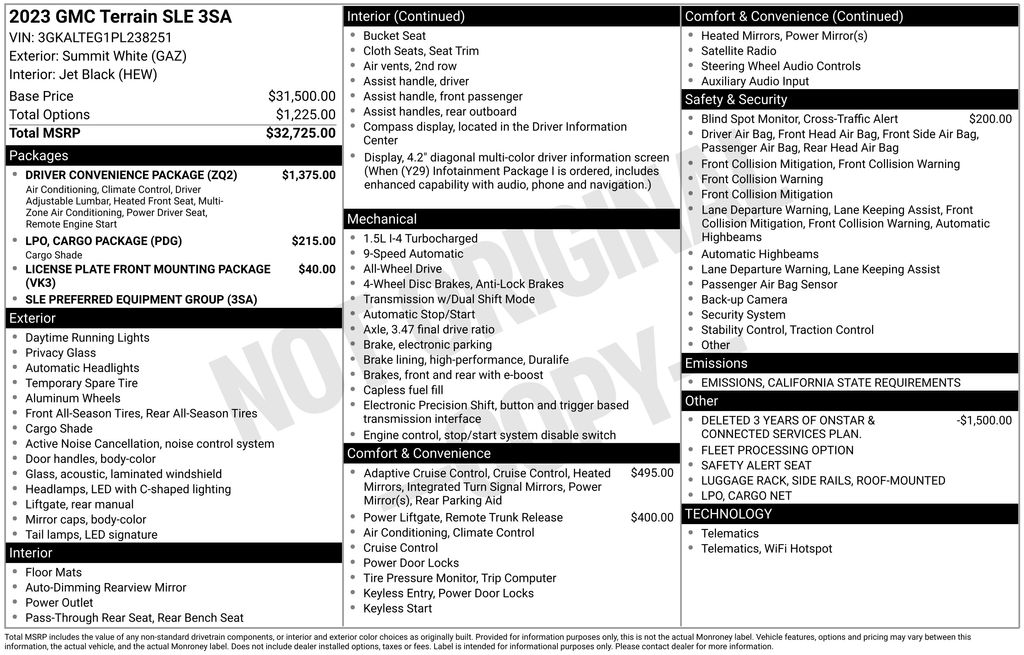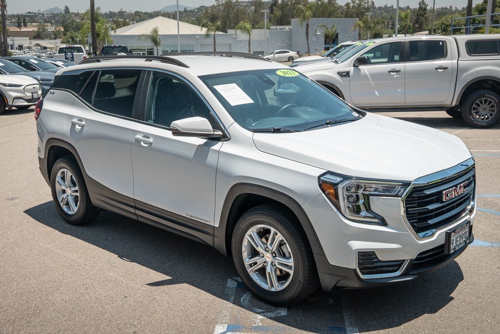 Summit White 2023 GMC Terrain SLE AWD 9-Speed Automatic 1.5L DOHC AWD, 8-Way Power Driver Seat Adjuster, Adaptive Cruise Control, Cargo Package (LPO), Driver & Front Passenger Heated Seats, Driver Convenience Package, Dual-Zone Automatic Climate Control, Lane Change Alert w/Side Blind Zone Alert, Lane Departure Warning System, License Plate Front Mounting Package, Outside Heated Power-Adjustable Mirrors, Power Driver Lumbar Control, Power Programmable Rear Liftgate, Preferred Equipment Group 3SA, Rear Cross-Traffic Alert, Rear Park Assist, Remote Start, Retractable Cargo Shade, Roof-Mounted Luggage Rack Side Rails, Safety Alert Seat, Side Blind Zone & Rear Cross Traffic, Terrain Pro Safety Plus, Vertical Cargo Net (LPO), Wheels: 17" x 7" Silver Painted Aluminum.Odometer is 25208 miles below market average! 24/28 City/Highway MPG