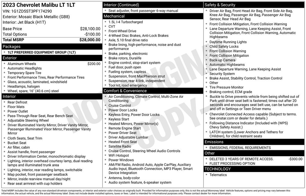 Mosaic Black Metallic 2023 Chevrolet Malibu LT 1LT FWD CVT 1.5L DOHC Jet Black Cloth, 18" Bright Machined Aluminum Wheels, Apple CarPlay/Android Auto, Exterior Parking Camera Rear, Preferred Equipment Group 1LT, Remote keyless entry, Wireless Apple CarPlay/Android Auto.Recent Arrival! 27/35 City/Highway MPG