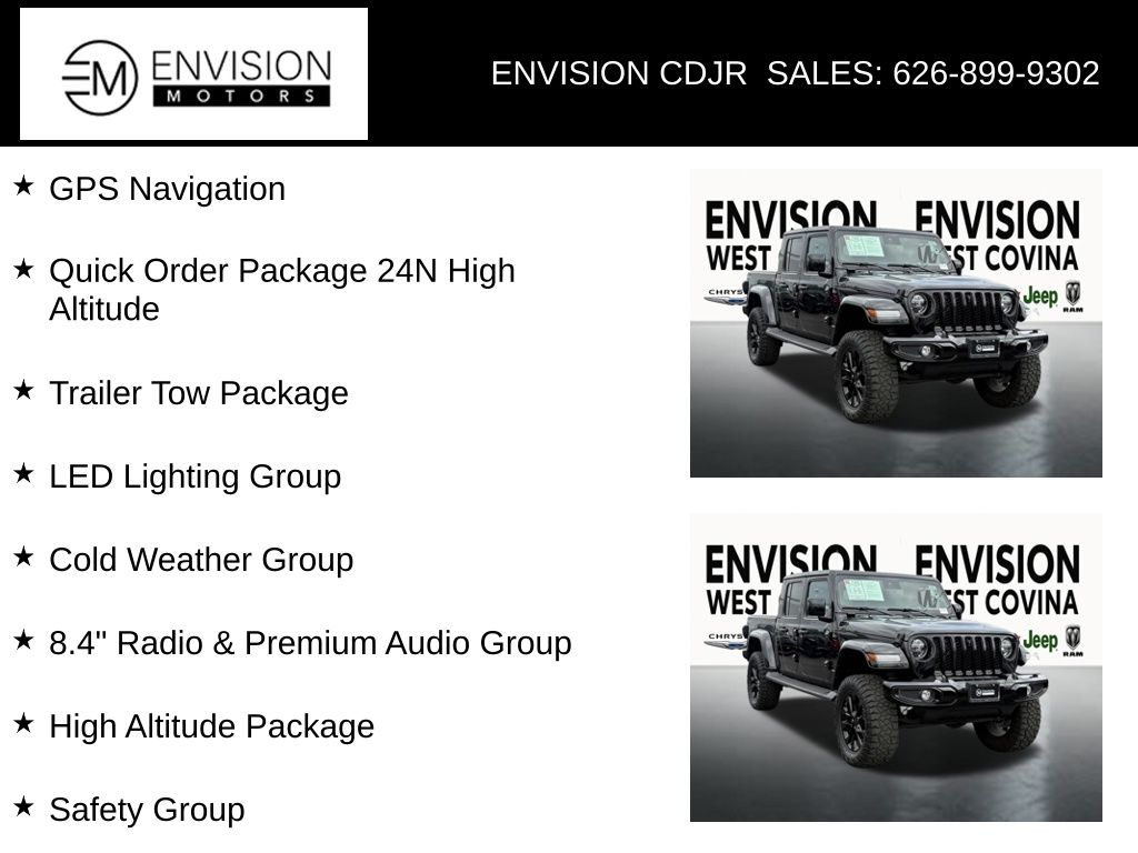 WE SPECIALIZE IN ALL CREDIT PROFILES! See what we can do for you! Call to find out (626) 899-9302.Certified. CARFAX One-Owner. Clean CARFAX.Odometer is 16324 miles below market average! 1-Year SiriusXM Guardian Trial, 240 Amp Alternator, 5-Year SiriusXM Traffic Service, 5-Year SiriusXM Travel Link Service, 8.4" Radio & Premium Audio Group, 8.4" Touchscreen Display, Advanced Brake Assist, Advanced Safety Group, Alpine Premium Audio System, Auto High Beam Headlamp Control, Auto-Dimming Rear-View Mirror, Blind Spot & Cross Path Detection, Body Color 3-Piece Hard Top, Body Color Exterior Mirrors, Body Color Front Bumper, Body Color Grille w/Gloss Black Rings, Body Color Rear Bumper w/Step Pads, Body-Color Door & Tailgate Handles, Caramel Interior Accents, Class IV Hitch Receiver, Cold Weather Group, Dana M210 Wide Front Axle, Dana M220 Wide Rear Axle, Daytime Running Lamps LED Accents, Emergency/Assistance Call, For Details, Visit DriveUconnect.com, Freedom Panel Storage Bag, Front LED Fog Lamps, Full Body Color Fender Flares, Full Length Floor Console Premium Armrest, Full Speed Forward Collision Warning Plus, GPS Navigation, HD Radio, Heated Front Seats, Heated Steering Wheel, Heavy-Duty Engine Cooling, High Altitude Package, Leather Wrapped Park Brake Handle, Leather Wrapped Shift Knob, Leather-Trimmed Bucket Seats, LED Lighting Group, LED Park Turn Lamps, LED Premium Reflector Headlamps, LED Taillamps, No Soft Top, ParkSense Rear Park Assist System, Premium Dark Exterior Accents, Quick Order Package 24N High Altitude, Radio: Uconnect 4C Nav w/8.4" Display, Rear Armrest w/Cupholder Seat, Rear Sliding Window, Rear Window Defroster, Remote Proximity Keyless Entry, Safety Group, SiriusXM Traffic Plus, SiriusXM Travel Link, Sport Front Shock Absorbers, Sport Rear Shock Absorbers, Sport Suspension, Trailer Hitch Zoom, Trailer Tow Package, Wheels: 20" x 8" Gloss Black Aluminum, Wrapped I/P Bezel w/Caramel Stitch.Black Clearcoat2021 Jeep Gladiator High Altitude 4WD 8-Speed Automatic 3.6L V6 24V VVTFCA US LLC Certified Pre-Owned Details: * Vehicle History * Vehicles Up to 75,000 Miles and/or 5 Model Years. 24-Hour Towing & Roadside Assistance, Car Rental Allowance, CARFAX® Vehicle History ReportTM and an Introductory 3-month Subscription to SiriusXM® Satellite Radio & Certified Warranty Upgrades * Transferable Warranty * 125 Point Inspection * Limited Warranty: 3 Month/3,000 Mile (whichever comes first) after new car warranty expires or from certified purchase date * Roadside Assistance * Warranty Deductible: $100 * Powertrain Limited Warranty: 84 Month/100,000 Mile (whichever comes first) from original in-service date**********All Pricing and Advertised Prices for any/all vehicles offered for sale does not include dealer installed accessories which can be purchased for an additional cost.********** The Factory Rebates may not be available on this vehicle if you elect to take advantage of a Special Alternative APR or Special Lease program. Some Factory Rebates are California Resident specific and may vary for residents of other states. NO sales to Dealers, Brokers or Exporters. For out of state purchase, customers must be present to purchase. If shipping is required, dealership must facilitate; no exceptions. Please contact us for special Multi-Vehicle or Fleet pricing. Prices are plus government fees and taxes, any finance charges, $85 documentary fee, $29 electronic registration fee, any emission testing charge and $1.75 per new tire state tire fee. *** We make every effort to provide accurate information, but please verify before purchasing. Leasing & financing available on approved credit. Trade-ins accepted. Subject to prior sale.